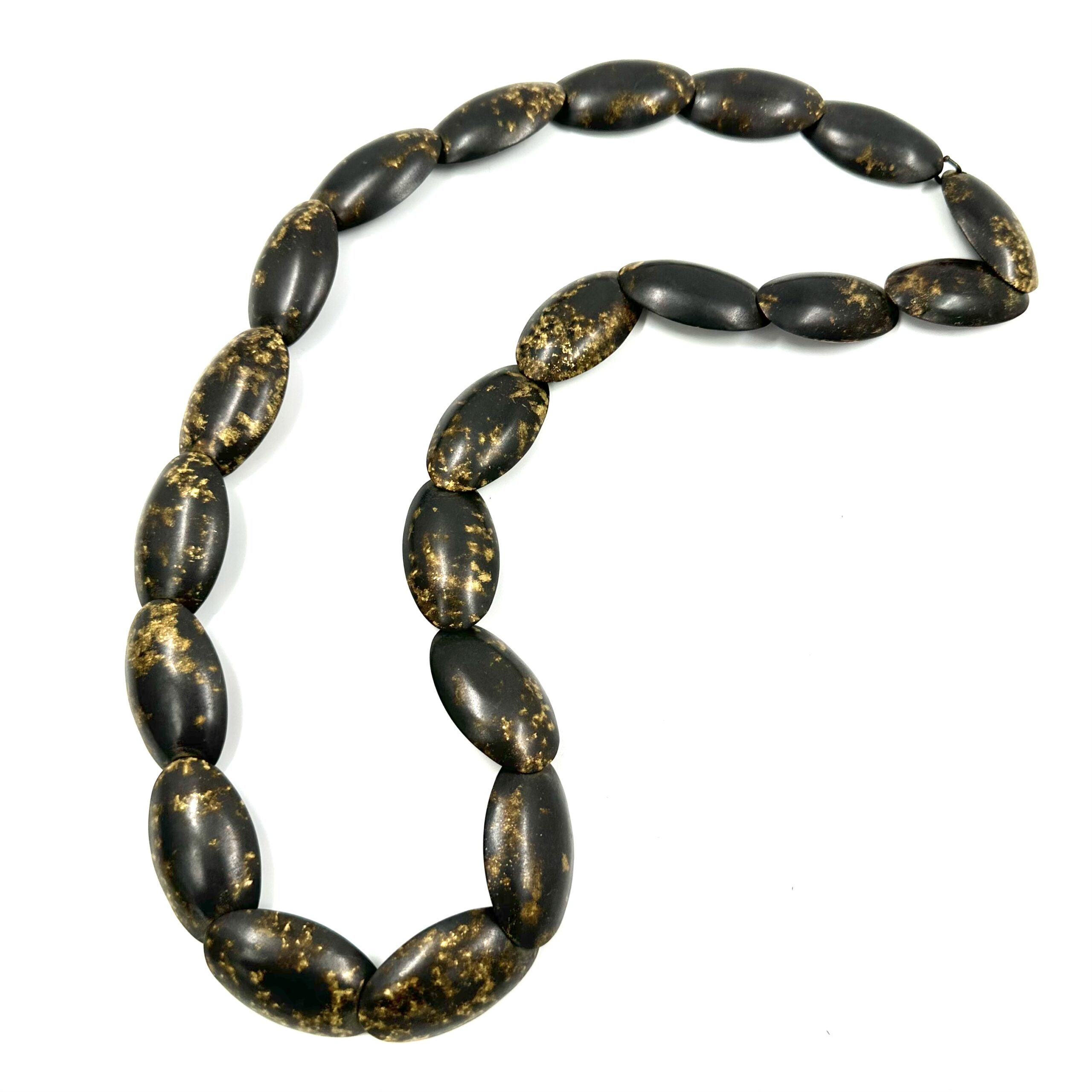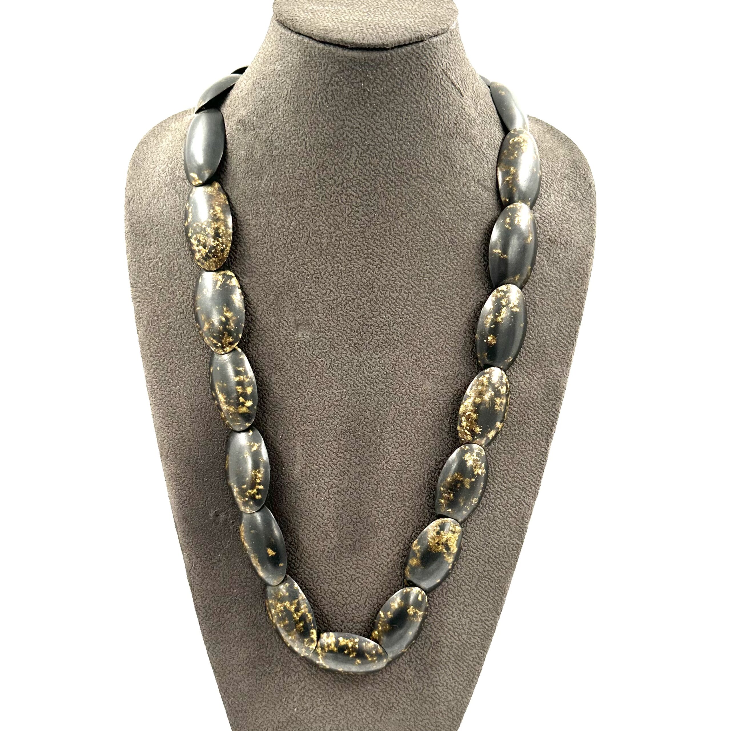 This Robert Lee Morris Speckled ย Egg Necklace, is part of the Egg series which preceded the Pebble collection in the mid 1980’s. It is a one of a kind piece. Moving away from the architectural direction in the early 1980’s, Morris pursued the Egg form. Here is a spectacular necklace that packs a visual punch! The eggs were hollow castings from wax carvings, joined with a rivet system underneath. The most unusual and permanent patina is a speckled brownish gold color. As usual, this design was bold and powerful while also being classic and forever modern. The warm brass and worn look qualifies this for the Wabi Sabi category and the length of this necklace is gloriously dramatic.