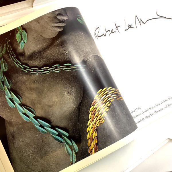 Working as a team, Klaus Laubmayer the German photographer and I created the beloved inventive and now famous Artwear Catalog in 1984, shortly after we had just published the RLM CATALOG. This remarkable publication became an instant collectors item. It focused around the three artists that were the anchors of the gallery, Ted Muehling, Cara Cronginger and myself, Robert Lee Morris. The rest of the gallery artists were shown in still life imagery. My work ws shot on two models who were covered in a concoction of mud, clay and pigments added in and generated an unearthly appearance very avant garde. Cara’s work was shown on body casts that were either frozen in ice or covered with sand, and the Ted Muehling model, Frauke, was embedded in a mound of white flour, an otherworldly look. Each book is signed by me, and is $25. Remember to select media mail as your method of delivery upon check out.