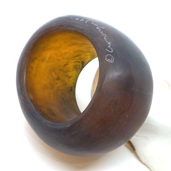 This scrumptious looking hunk of resin is beyond magical. It is nearly a ball (@ nearly 1 lb), and it slides right over the hand and sits at the wrist. The color is a deep translucent amber, warm and dark, but alive in the light. 2.5” wrist opening.