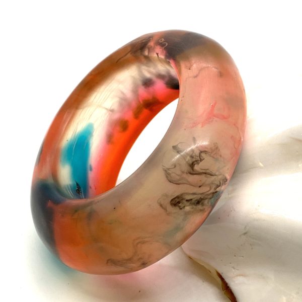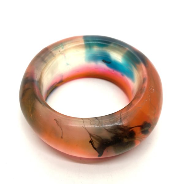 This is a hand carved resin bangle, thick, soft to the touch, with luscious translucent colors of cotton candy pink and ink spills of turquoise in this donut bangle. Cara was always able to make her jewelry look like delicious food or desert.