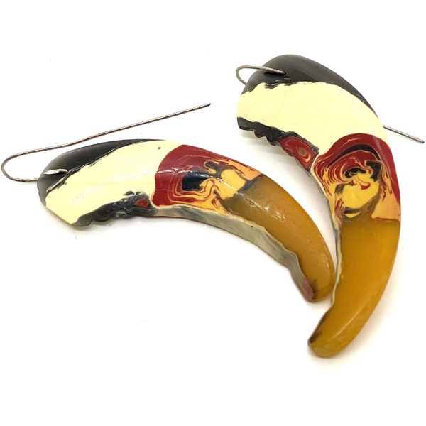These amazing earrings are paintings for your body, everyone who sees you will wonder and be awestruck by these earrings. What are they made of? Some exotic fossil or stone embedded life form? So cool these Fangs, which were a trademark of Cara, claws, teeth, fangs, bones were all part of her unique vocabulary. The color here is stunning, the range of opacity and depth is mesmerizing. The earth itself, with black obsidian, to jasper, amber and sap, blended together and frozen mid stream. Love of the southwest so strong here.