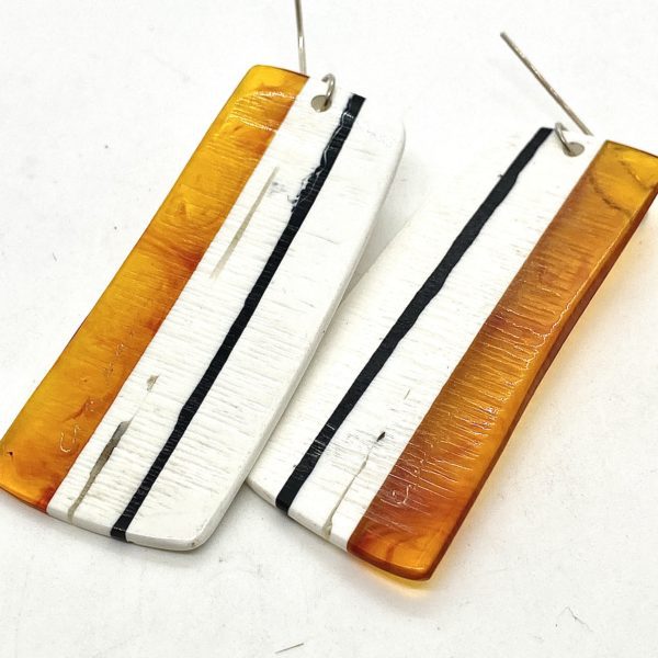 A painterly sculptress, Cara was always blowing my mind with her unique quirky and dramatic color schemes. Bold. Stripes. Long. Gorgeous resin earrings with silver wires. Below see the photos of her other pouring, each with a signature color range. Sheets of resin which were slicing off blocks of these poured resin blocks. Polished and turned into chic high fashion and art earrings.