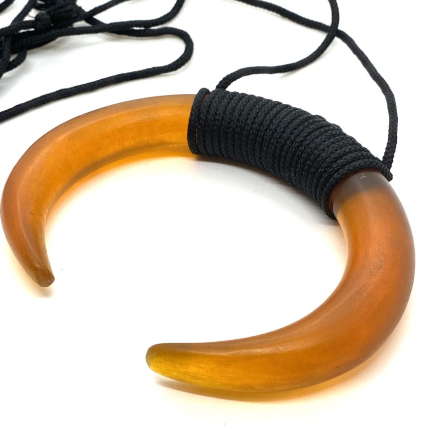 This striking object was made for a Geoffrey Beene show in the mid 1970s and it is a hand carved sanded and colored, wrapped with cord neckpiece in the form of a horn. Or is it a moon?