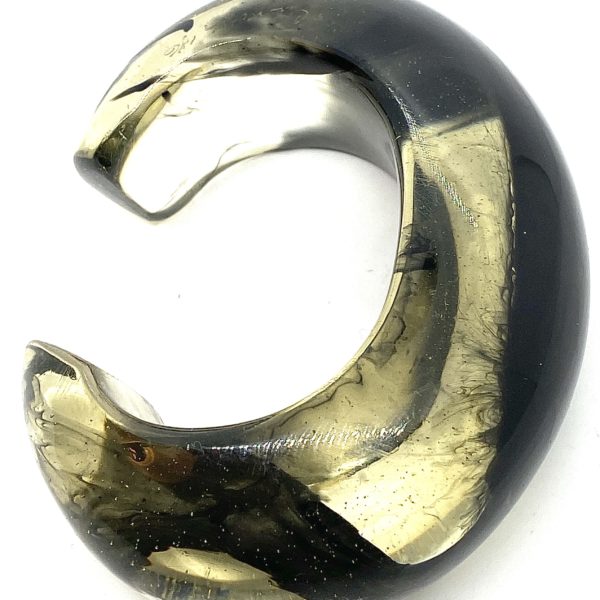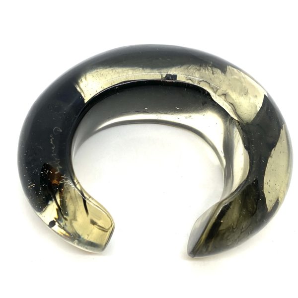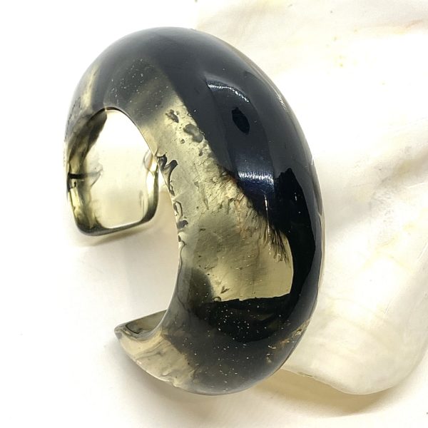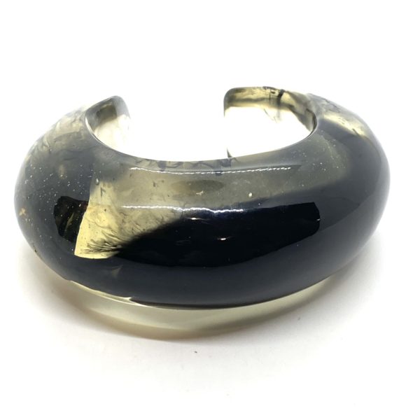 As always, this beautiful cuff is iconic in showing how painterly Cara was with her dyes and mix of transparent and opaque colors. The black in this sea of clear water, like ink, spills and flows like itโs alive. Bold. Rounded, chunky, gutsy and mysterious, this cuff is a winner.