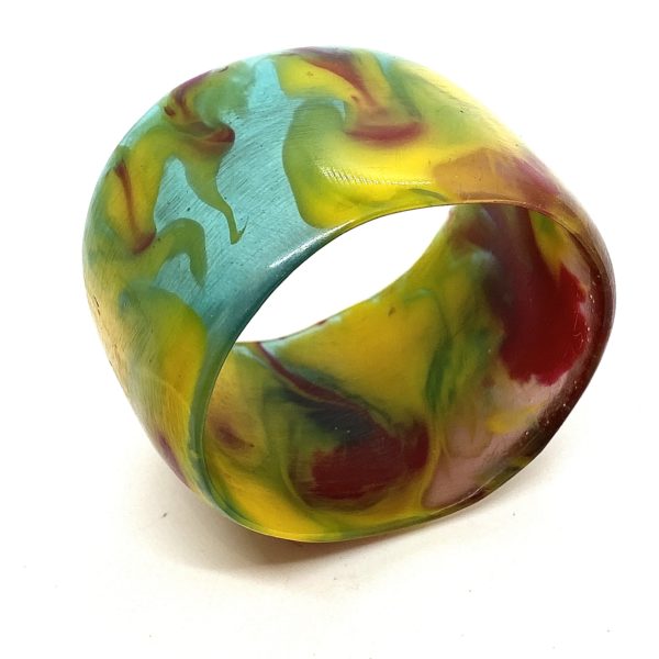 This bangle is a work of art. The fusion of curated colors, into a particular style of pouring the colored sections, and swirling them while still fluidโฆthus thus very wearable and comfortable piece. There is a blend between the transparent colors and the opaque ones.