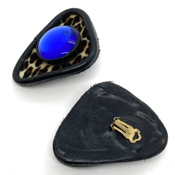 Gloria Lomas Leopard Skin Blue Glass Earrings!! Its Gloria Lomas. They are wild and fun and oversized and dramatic…everything Gloria is as a persona. She could wear these kinds of earrings and they looked small on her. Created in the late 1980’s, big shoulders and big earrings. Clips