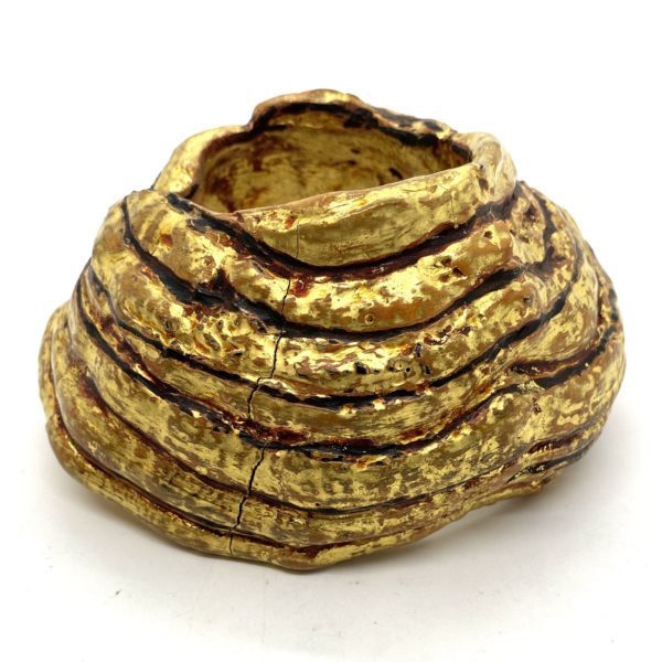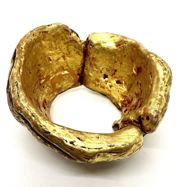 This Gloria Lomas Lichen Bangle With Catch Closure is so unusual and exotic because the artist has devised a way for a mechanical metal clasp to be imbedded into a plant form, the cactus plant. Gloria Lomas, who lived and loved in Miami and NYC, created a big bold style of jewelry with all kinds of inventive techniques. Many of the pieces that I acquired for my private collection were created from lichen, tree mushrooms, that harden into wood and can be dried and painted and worked with like wood. Gloria had a large style presence in every room. Her aura was bright and bold. Her work was intricately made using natural materials, paint, stones, instinct, and glue. I admire her style and her strength. This remarkable bangle made from tree lichen, has a hinged section that opens and closes with a metal plunger catch.