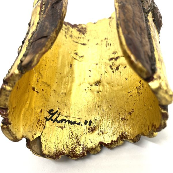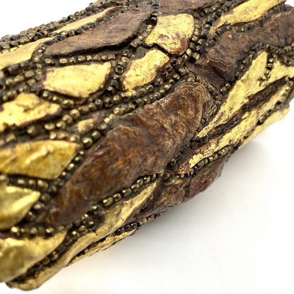 Gloria Lomas, who lived and loved in Miami and NYC, created a big bold style of jewelry in all kinds of inventive techniques.Many of the pieces that I acquired for my private collection were created from lichen, tree mushrooms, that harden into wood and can be dried and painted and worked with like wood. Gloria had a large style presence in every room. Her aura was bright and bold. Her work was intricately made using natural materials, paint, stones, instinct and glue. I admire her style and her strength. This dramatic cuff is constructed of wood, and has been gold leafed, and trimmed with tiny beads that are fixed into the “veins” of the bark design.