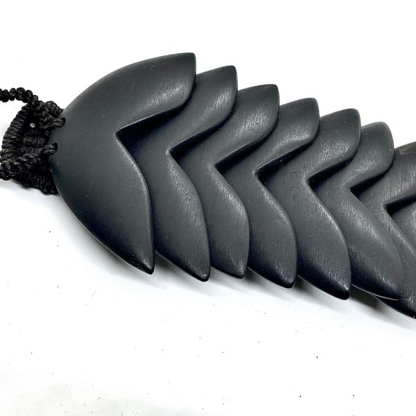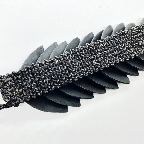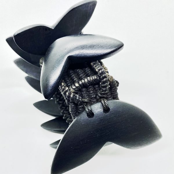 Kris Ruhs completely hand made bracelet with “leaf or fin motif” that overlaps when folded flat and when worn is dynamic frozen motion. Polished ebony and linen cording.