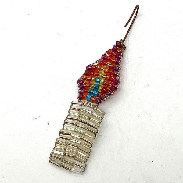 As part of the narrative jewelry school. Mary Hayslip brought a fresh wind into Artwear, with her southern Texan style and attitude with a voodoo angle. Her beaded one of a kind , single earrings was so on trend with the times. Mary was one of the new talent discoveries in my SPIRIT exhibition in 1984. This is a single candle earring, with multiple colors of beads that tell the story of this particular flame. The candle in the wind. The candle you light before meditation. It is a simple earring but full of life.