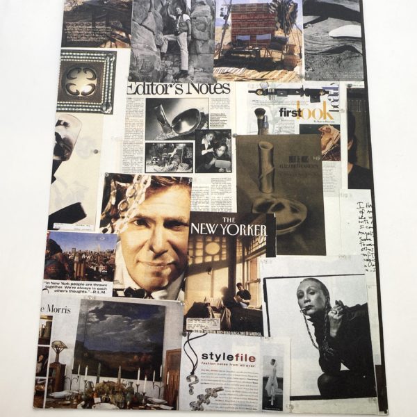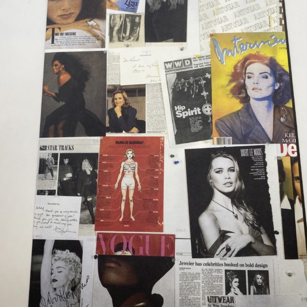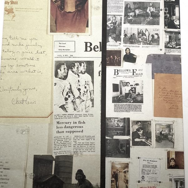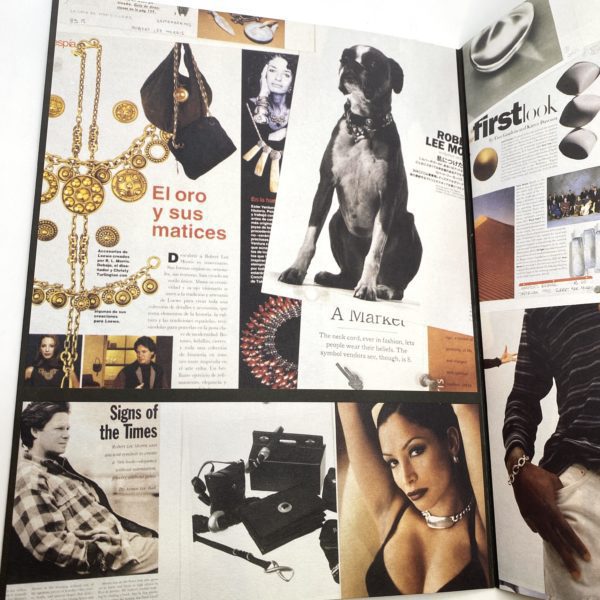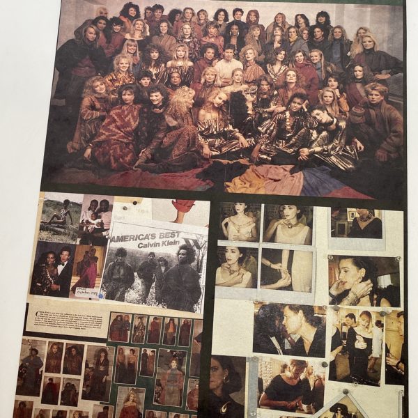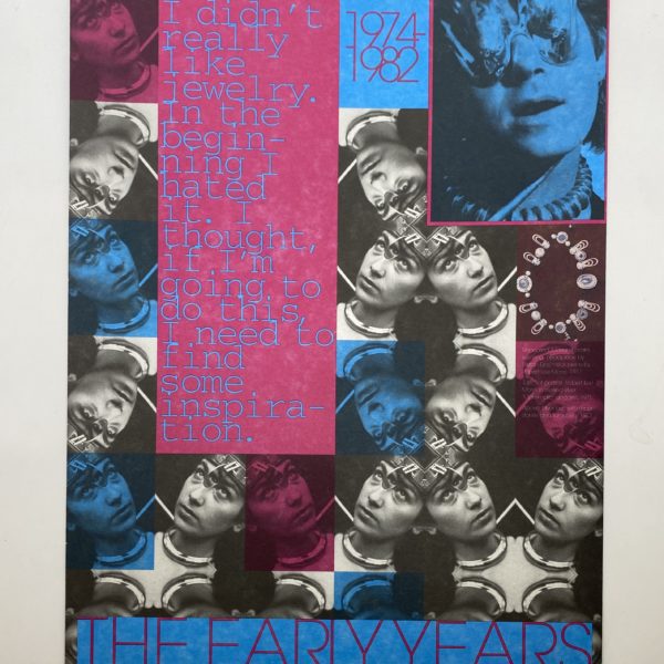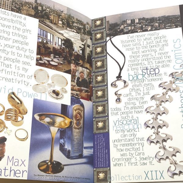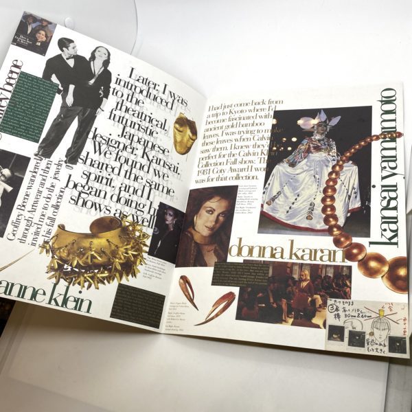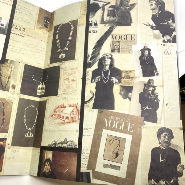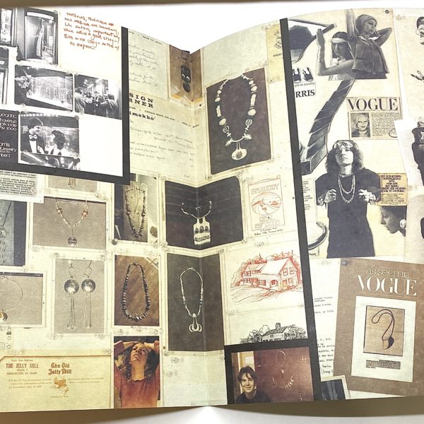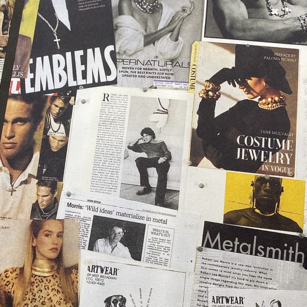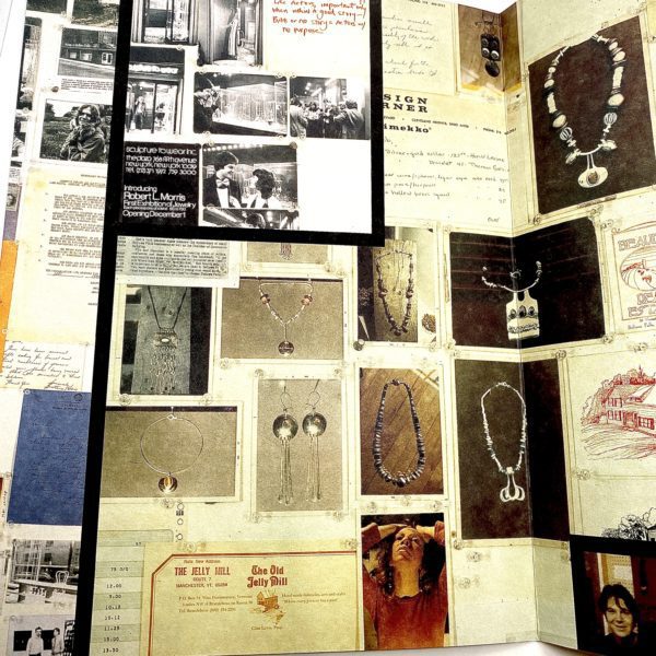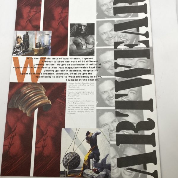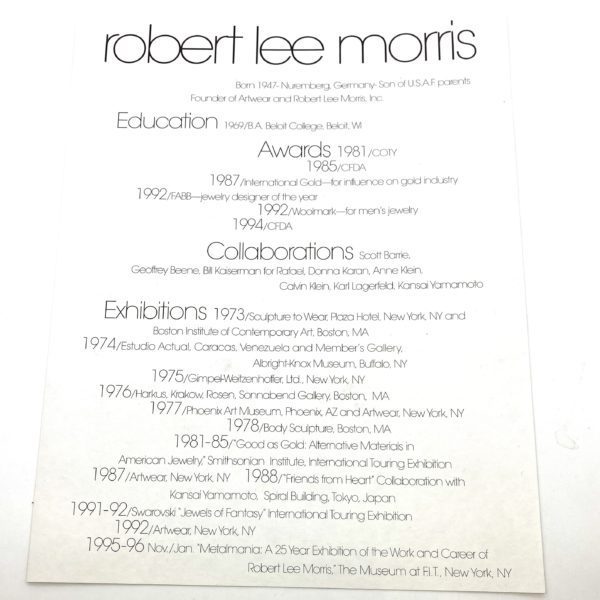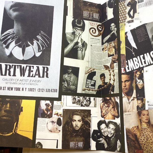 This very rare and extremely limited “catalog” was created in 1995 for the 25 year retrospective exhibition at the Fashion Intstitute of Technology museum of Robert Lee Morris. Created by Madonna Badger and using the vast clippings and archives from the massive amount of published articles and photographs of the work of Robert Lee Morris, this is a series of four large fold out double sided posters, with printed acknowledgments and cover sheets bound and held within a transparent sleeve titled METALMANIA in silver ink.