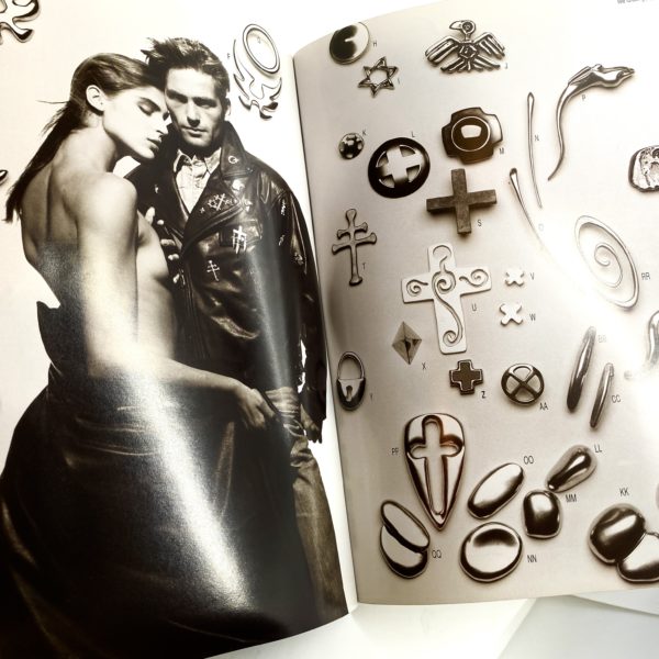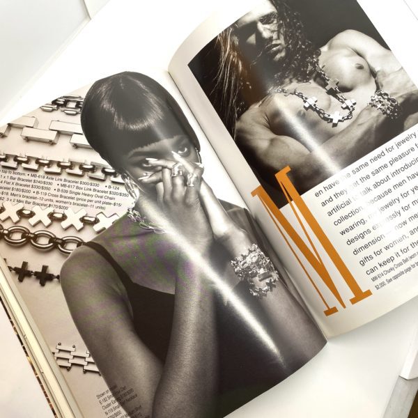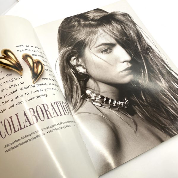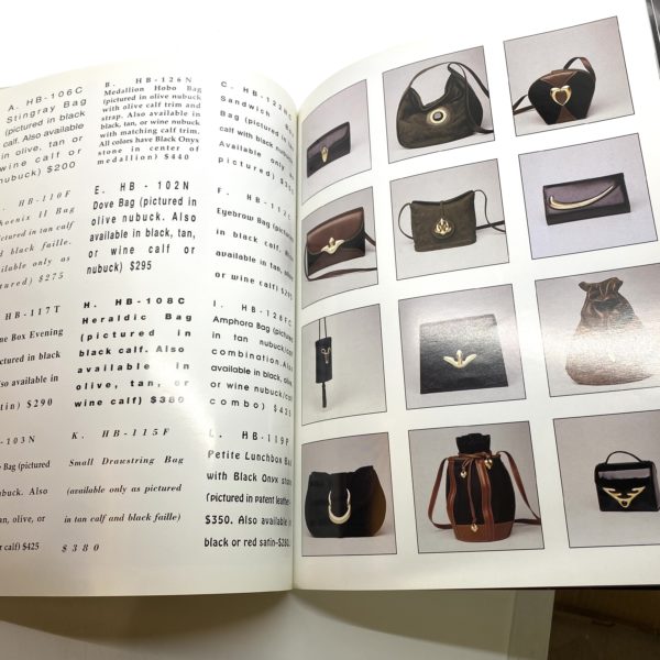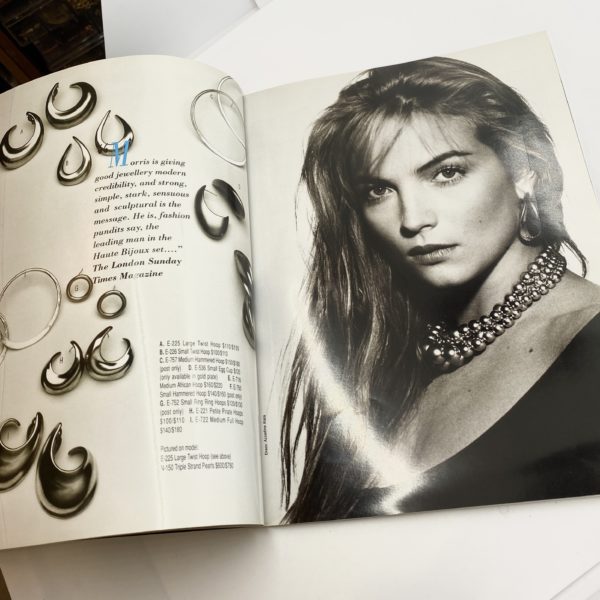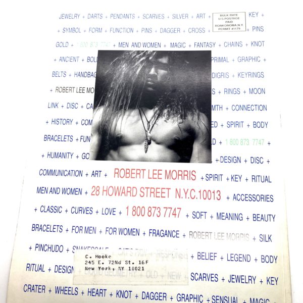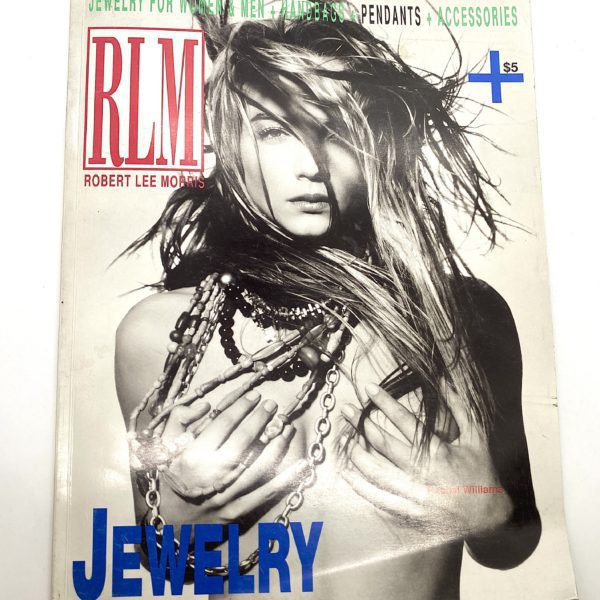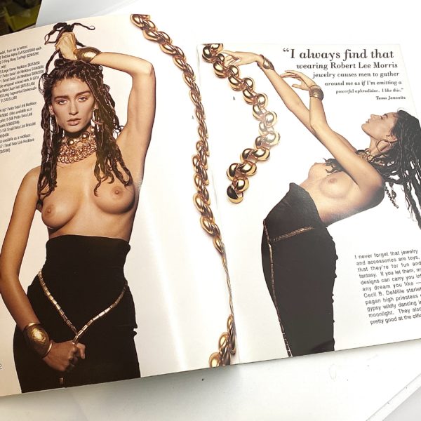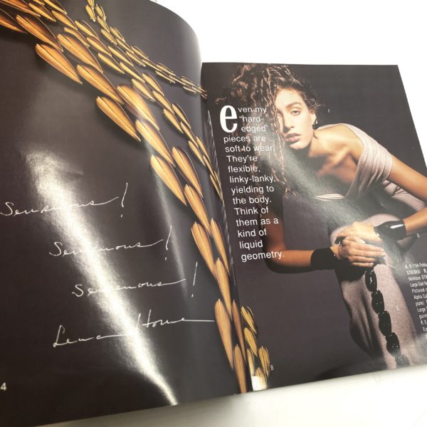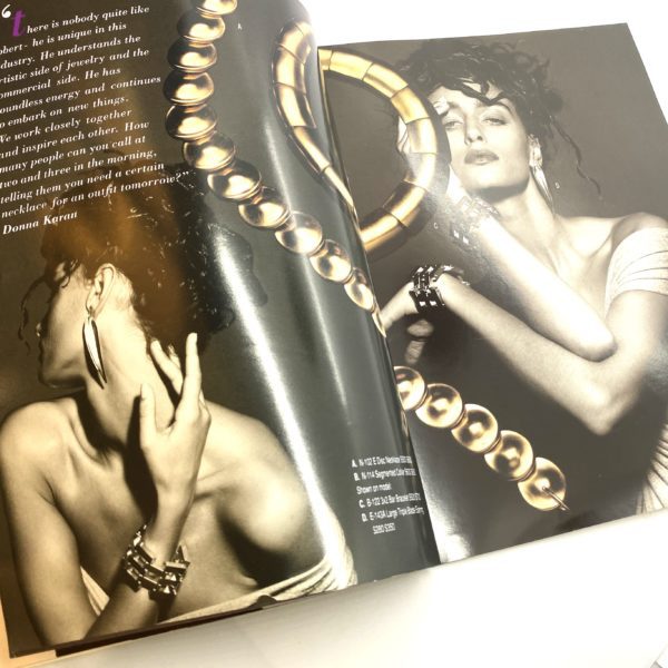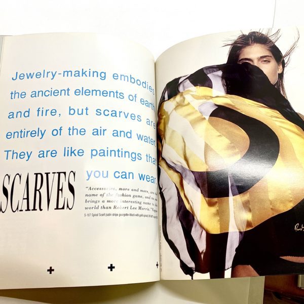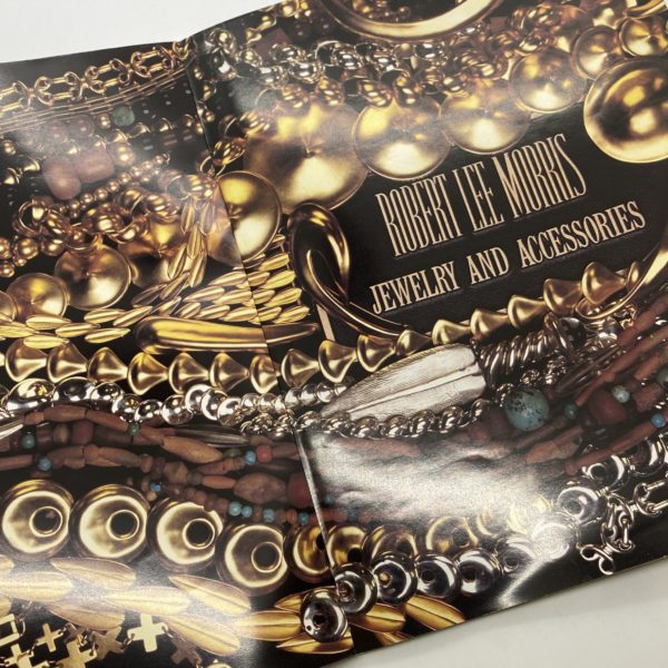 There are a very limited number of these very rare signed publications from Robert Lee Morris when the company was growing like wildfire. This booklet/magazine/ mail order catalog was an attempt to address the mail order business for the basic best sellers that the company had, the core pieces that were the moist popular. Photographer Klaus Laubmayer and super models Aly Dunne, Naomi Campbell, Rachel Williams, and Gabriel Reese made this a deluxe and prestigious piece of public relations. Due to the clever use of celebrity endorsements, and short quotes from the likes of Candace Bergen, Lena Horne, Tama Janowitz, Vogue and other high level glitterati along with the eyebrow raising photography, this “booklet” bcame a mega magnet for the fashion journalists who spread the word across the country and globe about the Robert Lee Morris world.