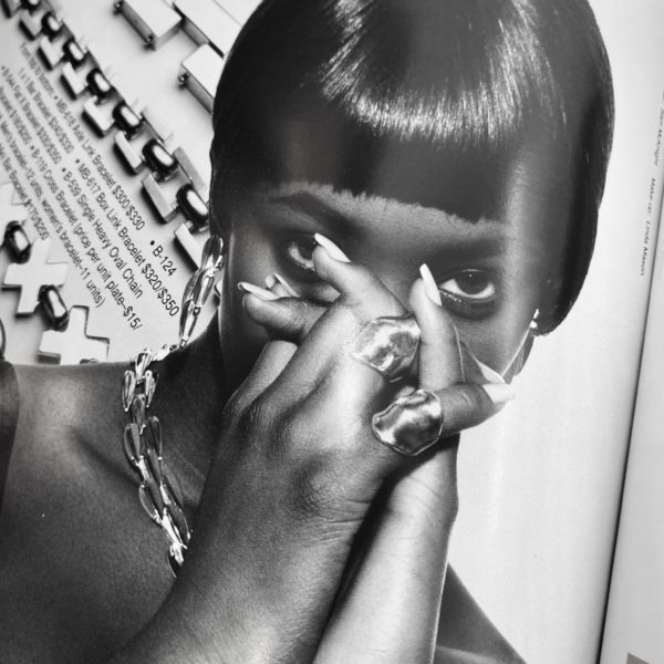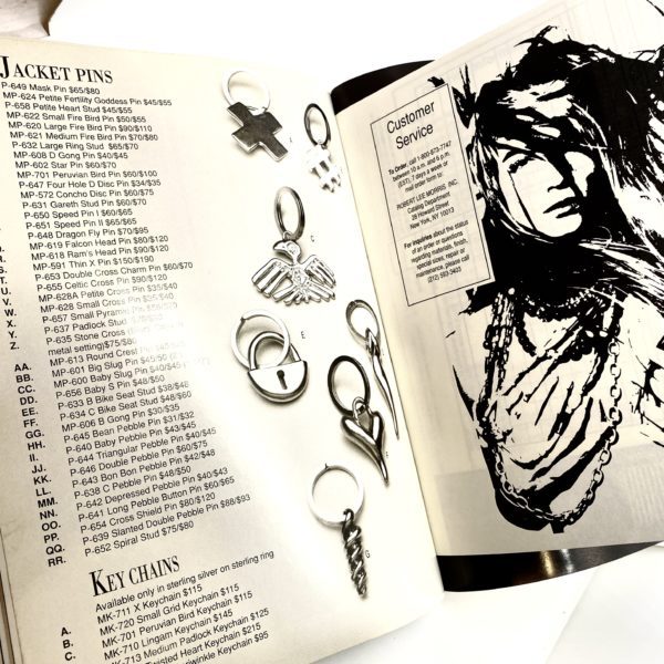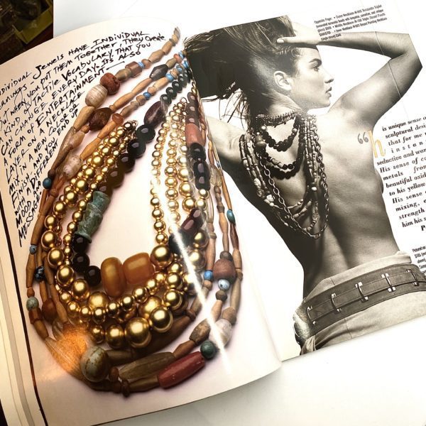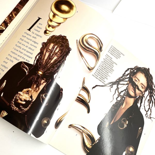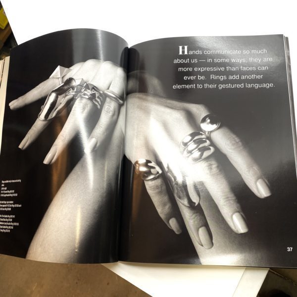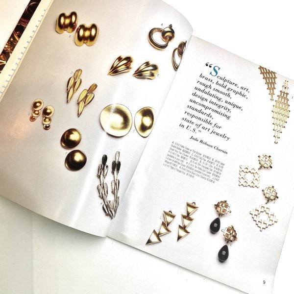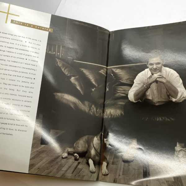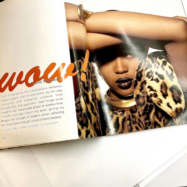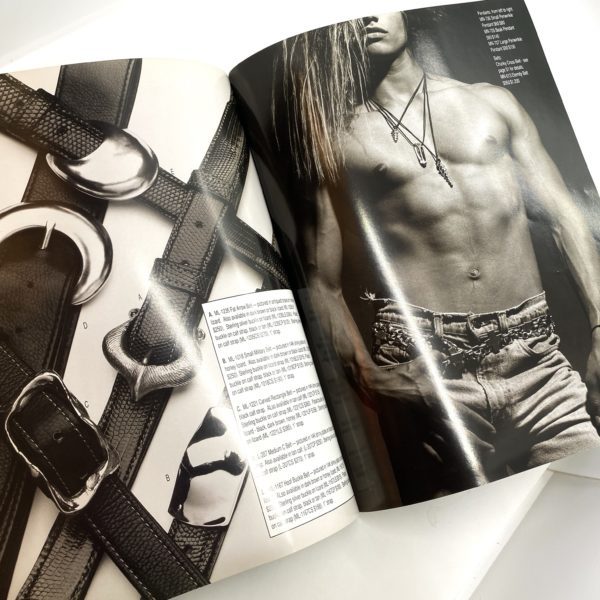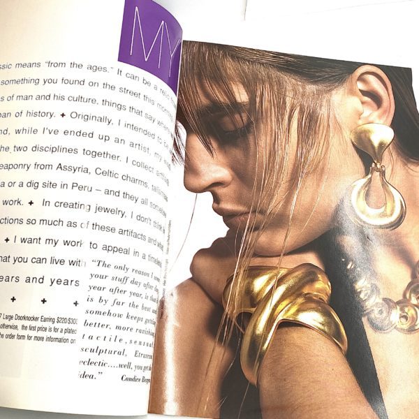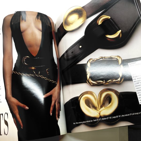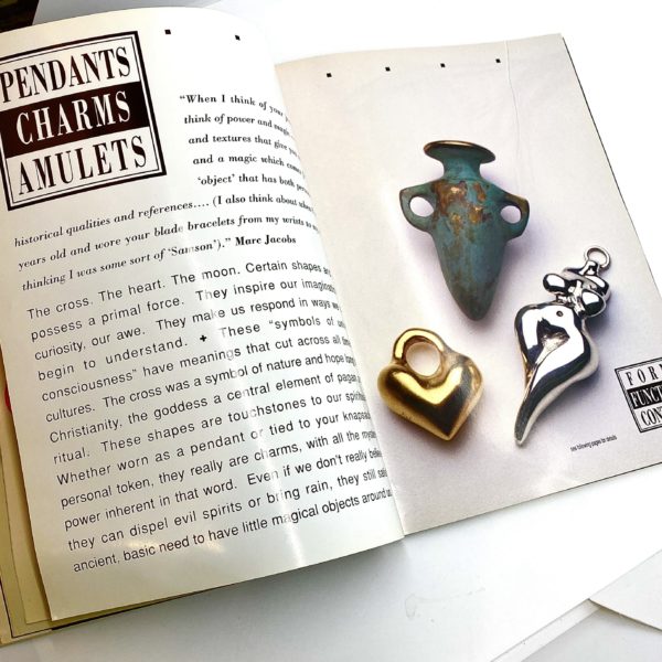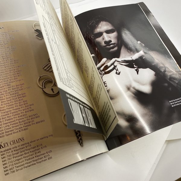 There are a very limited number of these very rare signed publications from Robert Lee Morris when the company was growing like wildfire. This booklet/magazine/ mail order catalog was an attempt to address the mail order business for the basic best sellers that the company had, the core pieces that were the moist popular. Photographer Klaus Laubmayer and super models Aly Dunne, Naomi Campbell, Rachel Williams, and Gabriel Reese made this a deluxe and prestigious piece of public relations. Due to the clever use of celebrity endorsements, and short quotes from the likes of Candace Bergen, Lena Horne, Tama Janowitz, Vogue and other high level glitterati along with the eyebrow raising photography, this “booklet” bcame a mega magnet for the fashion journalists who spread the word across the country and globe about the Robert Lee Morris world.