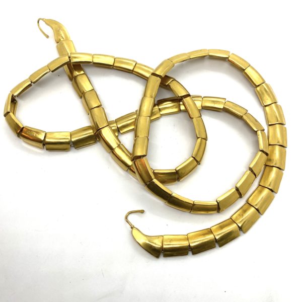 This Robert Lee Morris for Donna Karan Gold Plated Double Wrap Snakescale Belt/Necklace is an extra long belt and was a major part of the launch of the DONNA KARAN brand in 1985. The premiere runway show show featured this belt wrapped around such supermodels as Paulina, and Iman. Gold plated brass, the iconic RLM construction style shows how well Donna and Morris collaborated. With a sculpted hook at each end the belt could hook anywhere for wherever the drape was needed. Black and gold were the major theme and my voluptuous sculpted golden jewelry on the black stretch jersey fabrics was the perfect moment in fashion history. This was the ground breaking collection that launched both Donna on her own and pushed Morris faster and higher into his new directions.