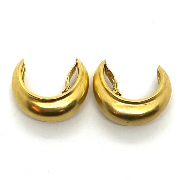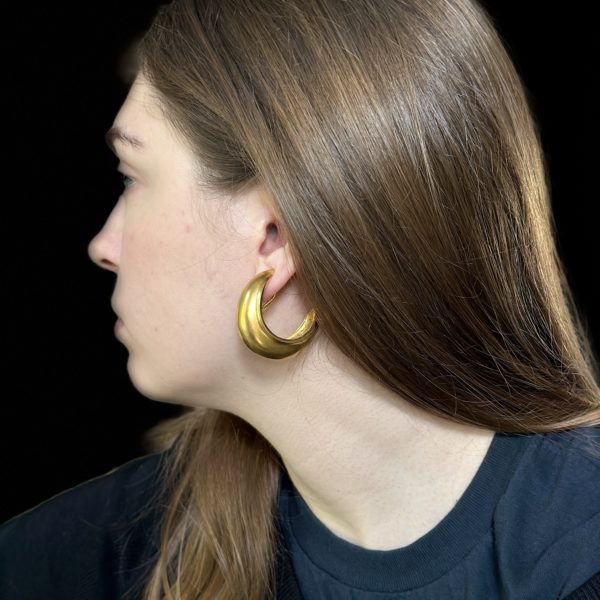 The family of bubble hoops that I created in the late 1980’s for Donna Karan, were a huge success with sales across the board. These are the medium size, a great daily earring that goes from day into night, from the office to the restaurant. Gold plated brass, clips. The photo below shows the comparison of sizes for the bubble hoop family.