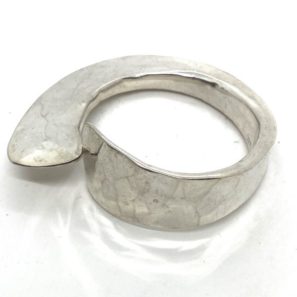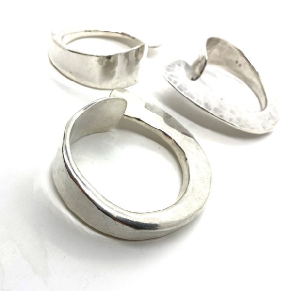 This piece is an incredible mass of pure fine silver. Heavy at nearly a half a pound, and marvelous to not only wear, but to prop on a shelf as a sculpture! There is a comparison photo showing the size difference between the set of 3 forged bangles next to this one giant bangle.