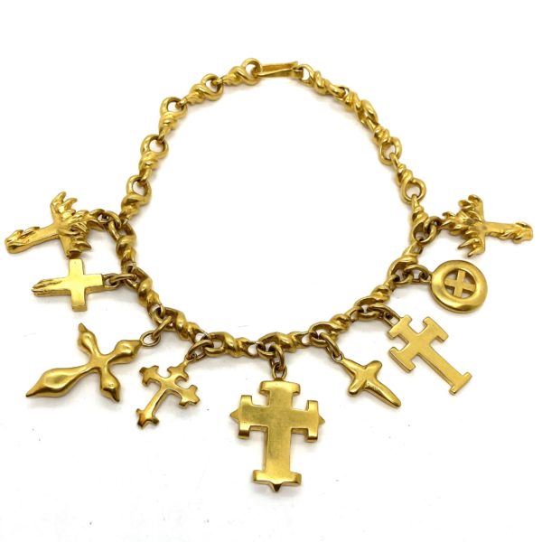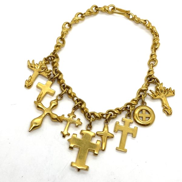 This Robert Lee Morris Nine Crosses Necklace is a perfect example of how fashion and sociology go hand in hand. Made during the very early 1990s, crosses became very popular in fashion and across many countries. This gold plated brass necklace has nine different carved cross forms hanging from a gnarly twisted even tortured-looking chain. The necklace is passionate, one of a kind, and a great collector’s item. Since these are solid brass castings, the necklace has some weight to it, like much of Morris’ work.