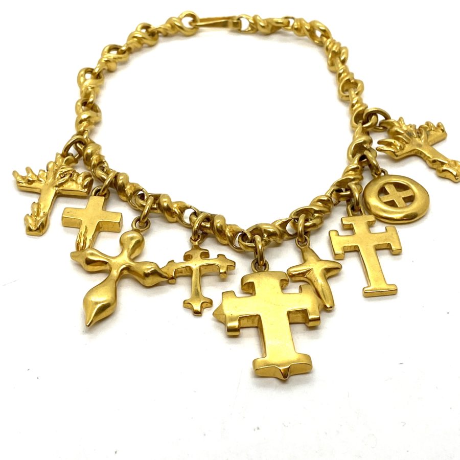 This Robert Lee Morris Nine Crosses Necklace is a perfect example of how fashion and sociology go hand in hand. Made during the very early 1990s, crosses became very popular in fashion and across many countries. This gold plated brass necklace has nine different carved cross forms hanging from a gnarly twisted even tortured-looking chain. The necklace is passionate, one of a kind, and a great collector’s item. Since these are solid brass castings, the necklace has some weight to it, like much of Morris’ work.