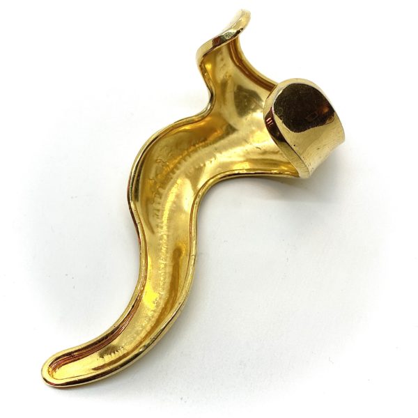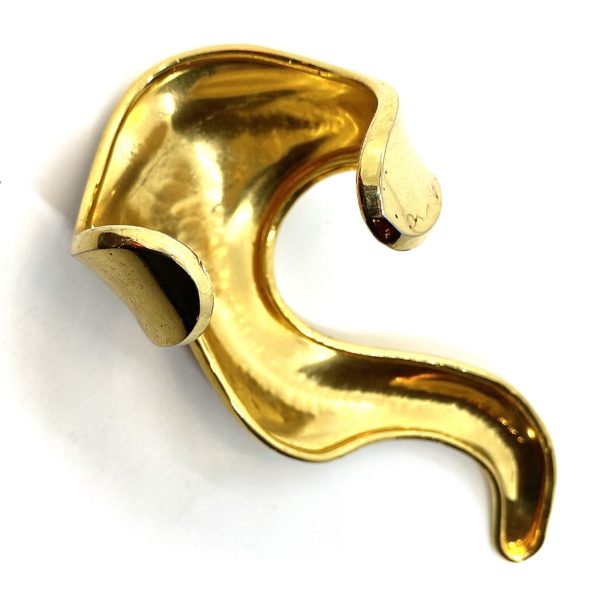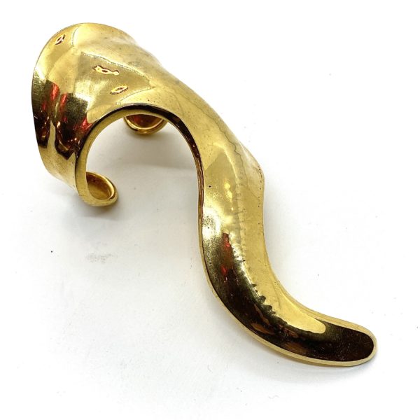 Shaped almost like an animal that is clinging to the arm, this is a one of a kind press piece. Shiny gold plated brass, and very wearable despite its dramatic leaning.