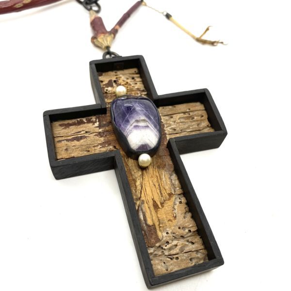 One of the most notable names in American Craft and Art jewelry is Robert Ebendorf. He has a global reputation of being a major innovator and leader in the academic art jewelry realms.This is just one of his many provocative works, that I purchased from a group exhibition at Artwear in the early 1990’s when the themes of crosses was rampant in the fashion world. Created with found and natural materials, a birds claw, pearls, an amethyst, silver and worm-eaten wood. It is a mysterious and narrative piece from one of the legends.