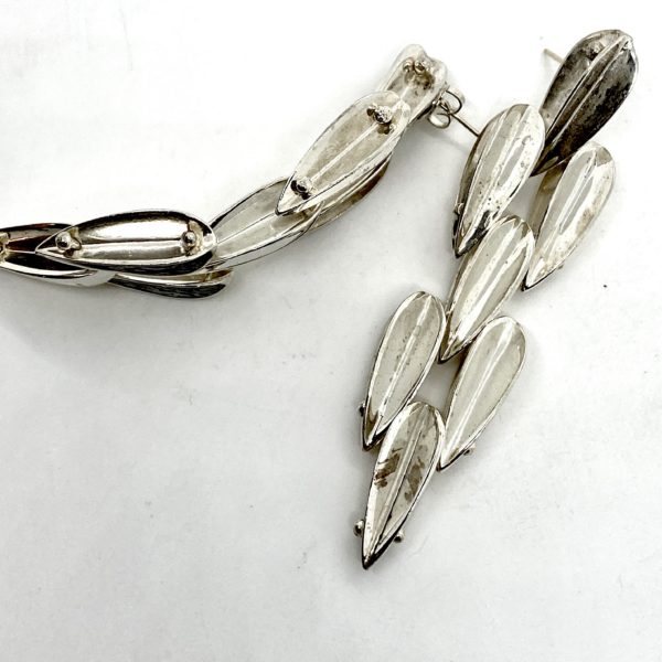 Sterling silver earrings with 14k gold posts, created in 1982, using the Dart design. This form evolved after the super success of the BLADE earrings from the Calvin Klein show in 1981, for which I won the Coty award. The Blade is a leaf form, and the Dart is like a double leaf, back to0 back. Like the feathers on the end of a dart, this form is architectural and original.