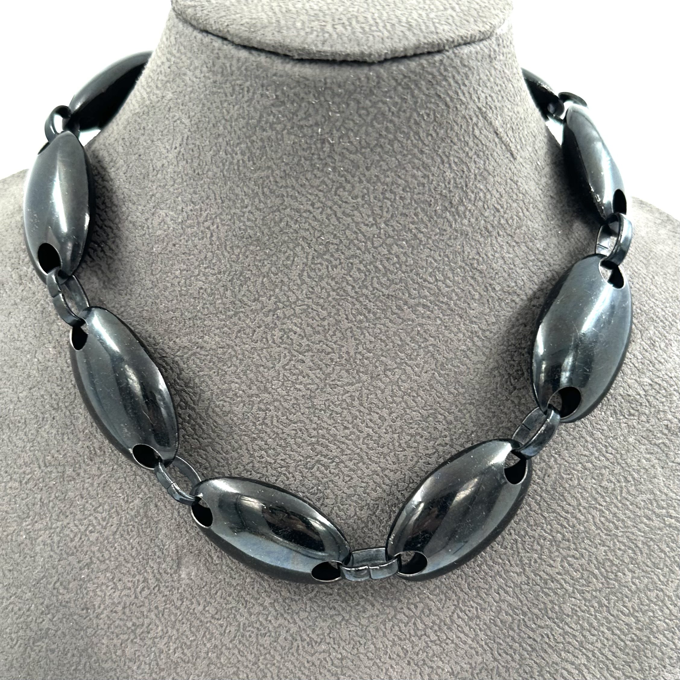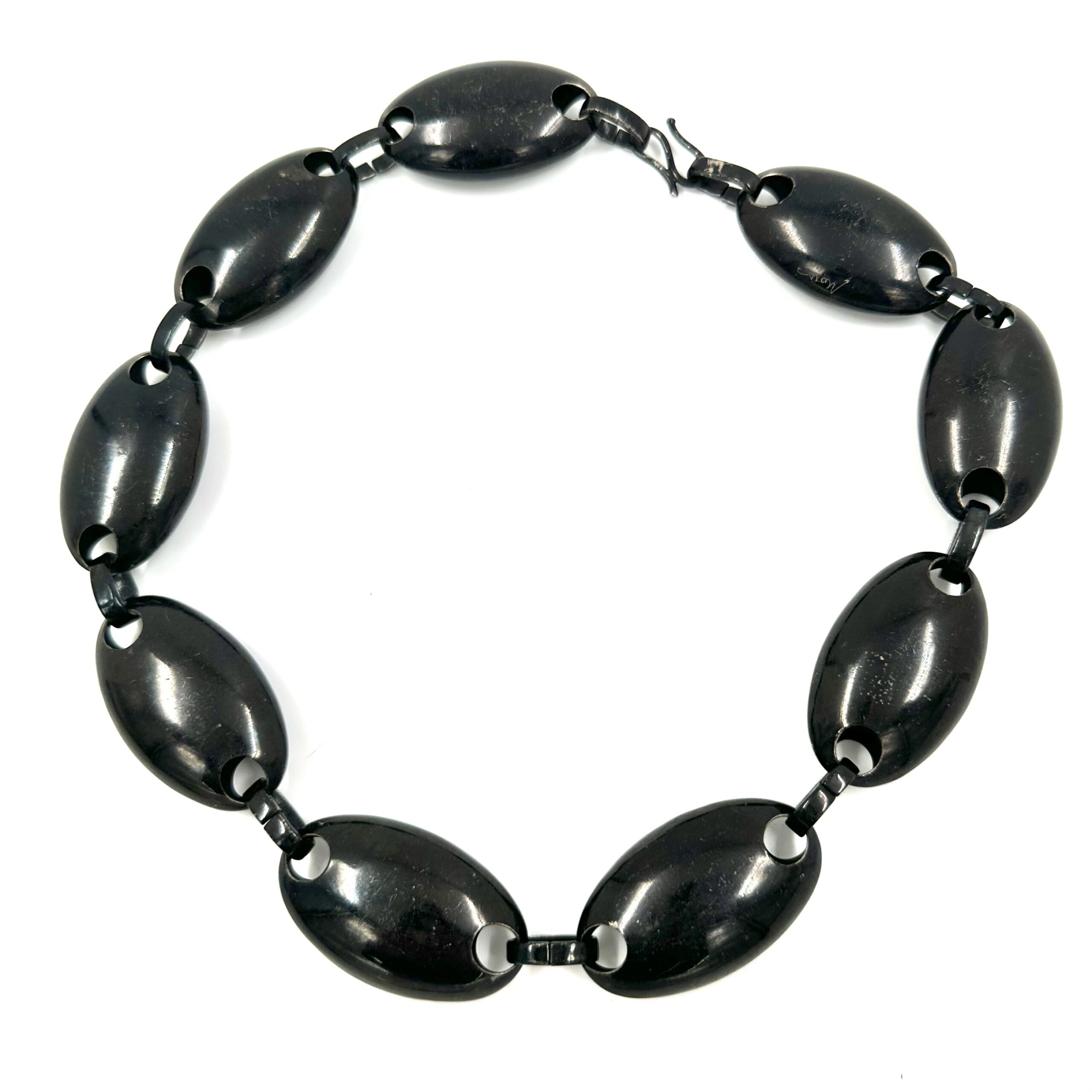 This unusual Robert Lee Morris Black Egg Link Necklace is a one of a kind showing the black electro plating that was popular in the mid 1980’s in NYC fashion. These hollow eggs forms are linked to one another with a big oval ring and gives a very big bold look while being very lightweight. Hook clasp.