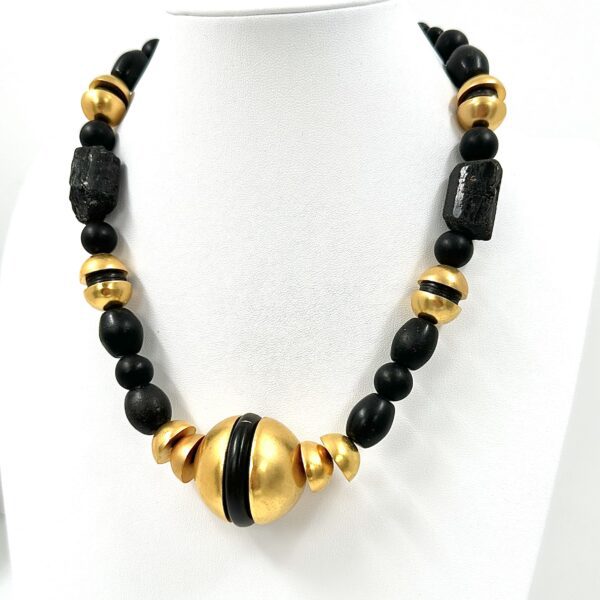 This one of a kind Robert Lee Morris Black & Gold Necklace #1 is composed of 14 hand made gold plated brass half spheres, black tourmalines, and black African glass beads. It is a powerful statement necklace on its own but can also be layered with other black and gold pieces to create a bigger look. ย The use of the handmade domes is what makes this piece as valuable as it is due to the vintage nature of them.