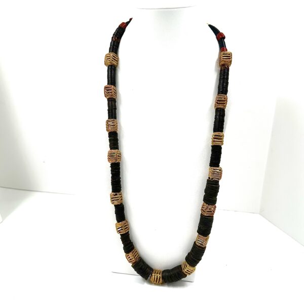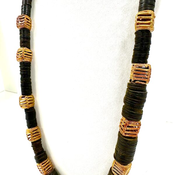 This one of a kind Robert Lee Morris Black & Gold Necklace #2 is composed of black coconut shell wafers, and African wire beads. This is a long (36″) necklace designed to be worn alone as is or nested with as variety of my other black and gold necklaces as see in the thumbnail photo. Very elegant looking for fall or winter accessorizing, with a tribal flavor.