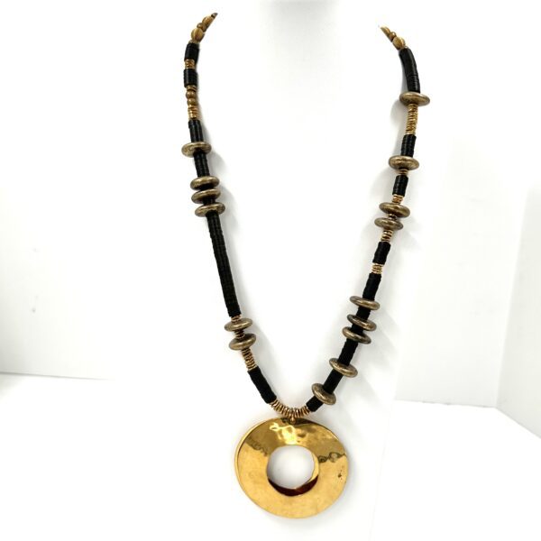 This one of a kind Robert Lee Morris Black & Gold Necklace #4 is a fun and dramatic necklace that can be worn alone or layered with other similar necklaces. This is composed of a variety of gold plated and gold toned beads with coconut shell wafers. the hanging brass disc pendant is a double sided one with the parts free swinging.
