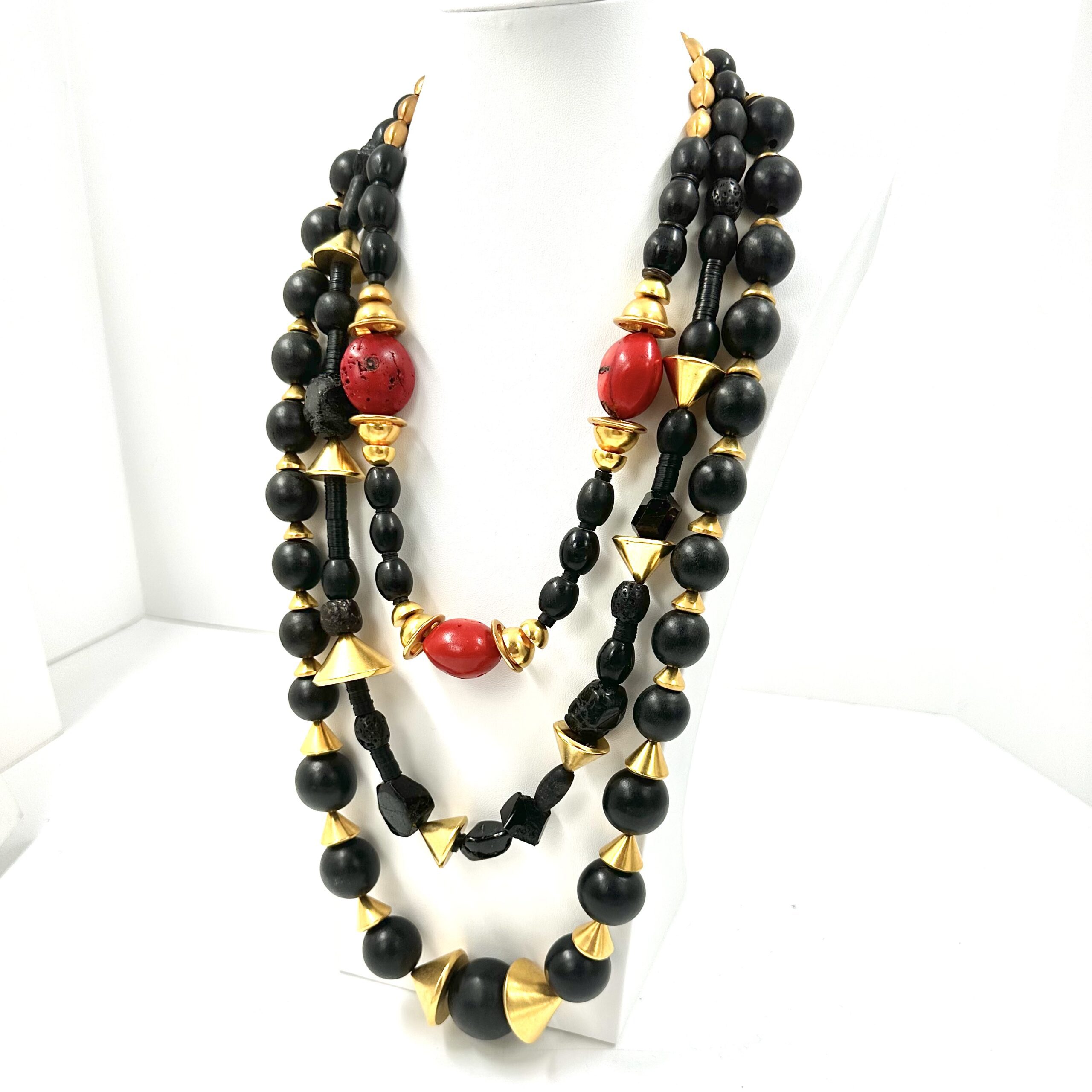 This one of a kind Robert Lee Morris Black & Gold Necklace #9 is composed of black African glass trading beads, coral, and gold plated domes, and cast wheel forms. It is a striking dramatic necklace with a bold black gold and red statement.