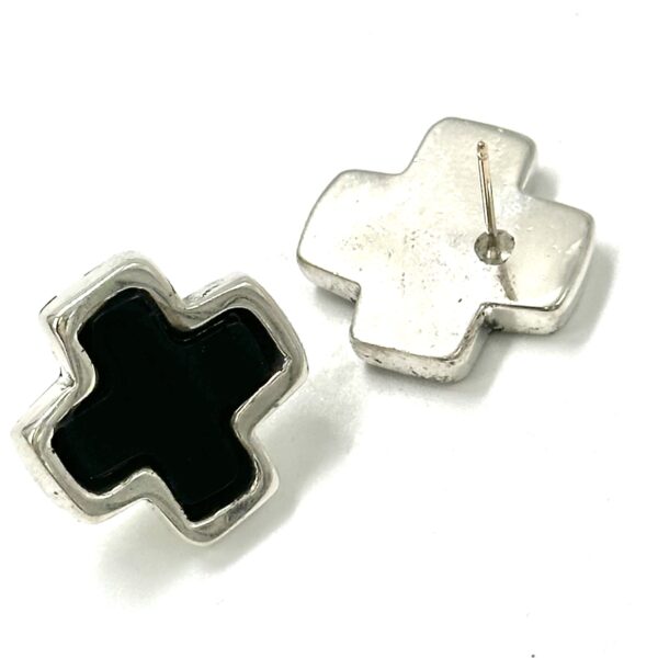 These Robert Lee Morris Black Onyx Silver Cross Earrings are so rare since Morris rarely used stones in his jewelry other than beads. These discrete pierced earrings, with 14k posts, have inlaid black onyx crosses surrounded by a thick sterling silver bezel.