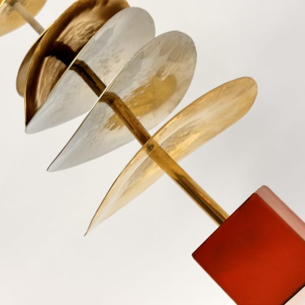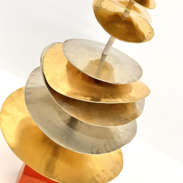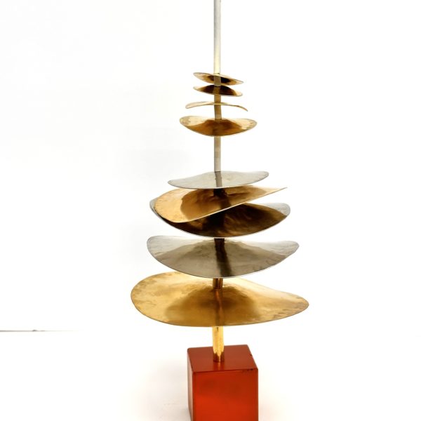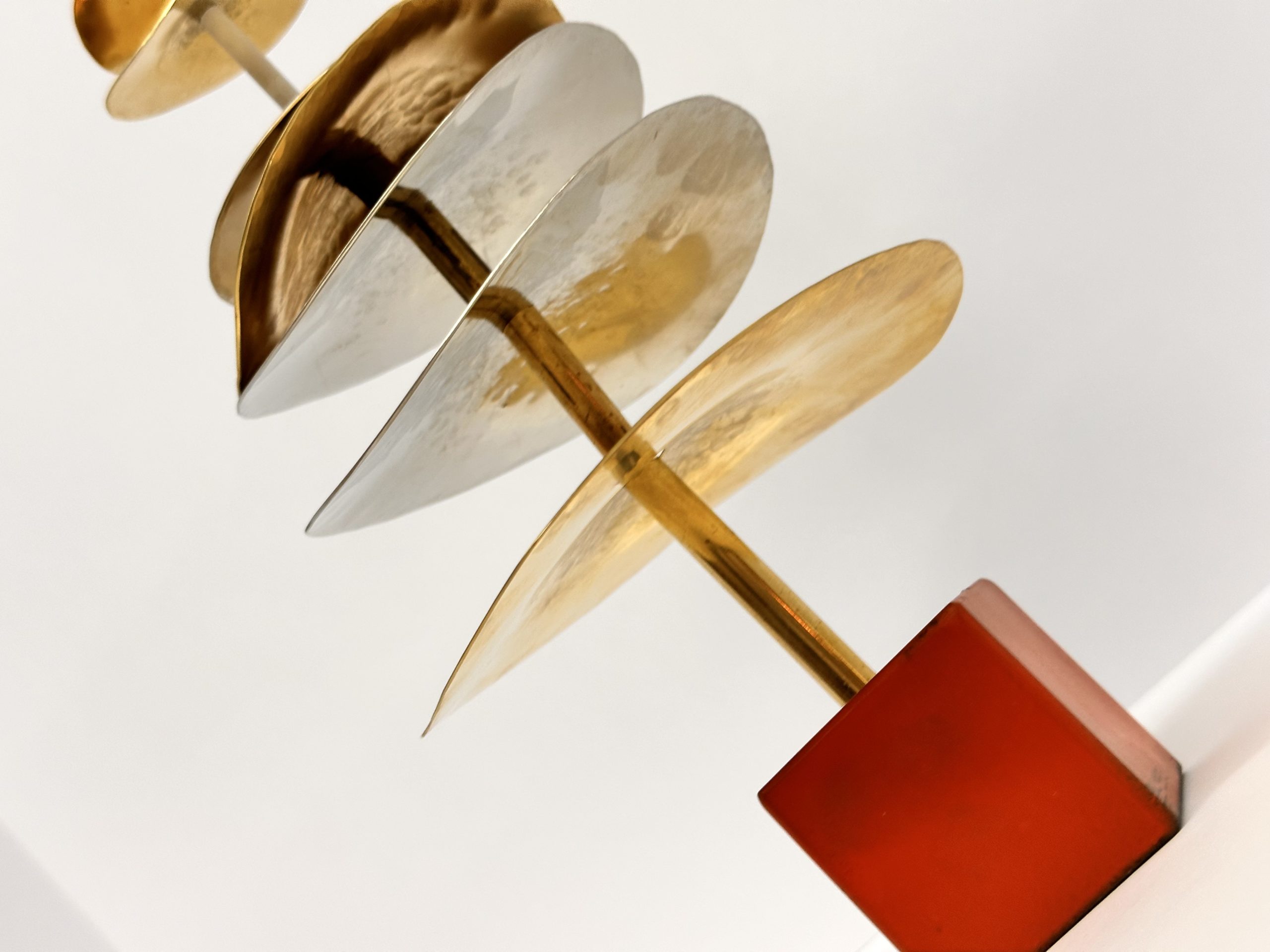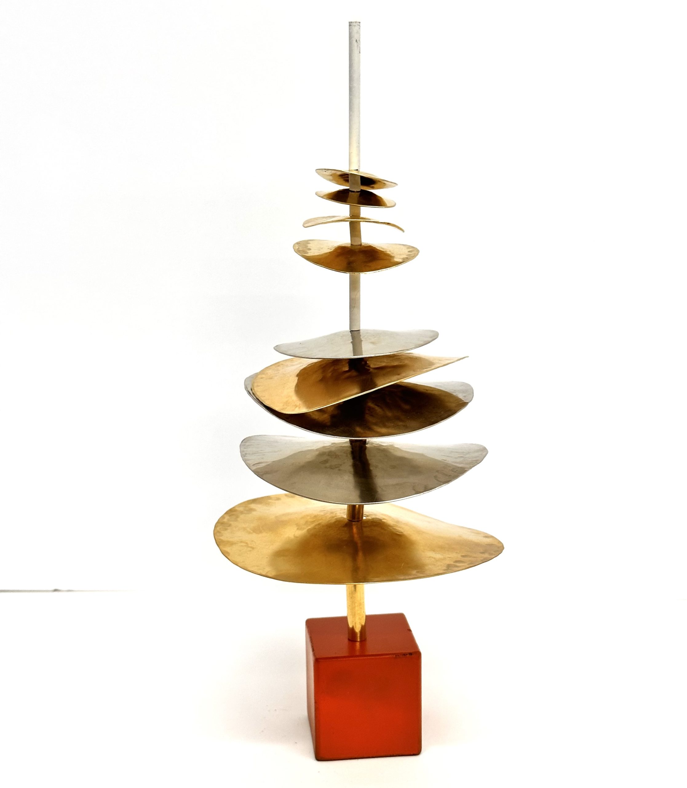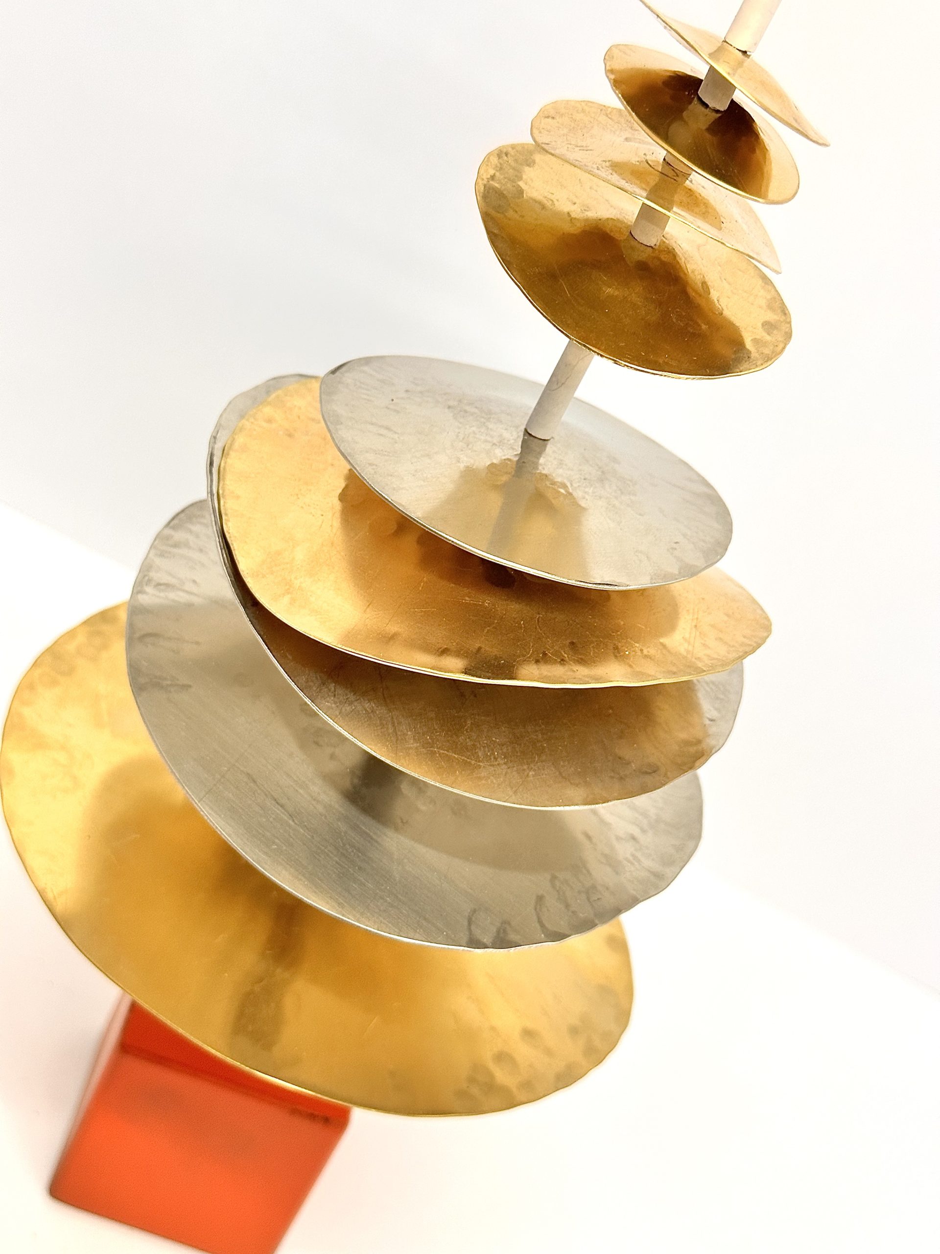 Robert Lee Morris Brass and Nickel Sculpture #103, Miniature Tree Stack is a very small work of art that is perfect for the home as an accent of color and metal on ones bookcase, or living room decor. The base is a vermillion wooden cube, and the forged discs of the sculpture are two tone, Â both brass and nickel silver. Stacks is the name Morris gives to the constructions that are similar to the Eucalyptus plant, where the round leaves run along a vertical stem. Designed to be shown as a single sculpture for a desk or small table, this is part of a series of small Stack sculptures meant to be grouped together as seen in the gallery photo. The vermilion accent color is a new feature of the work that Morris is currently making.
