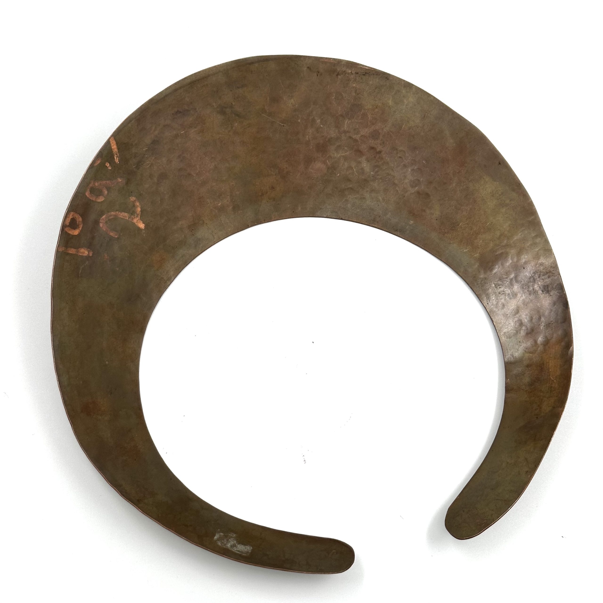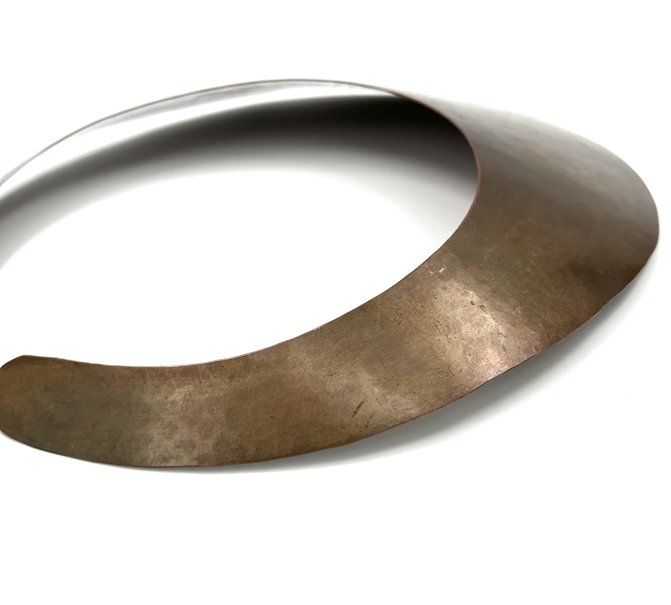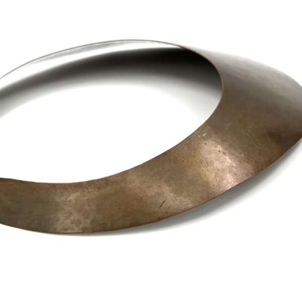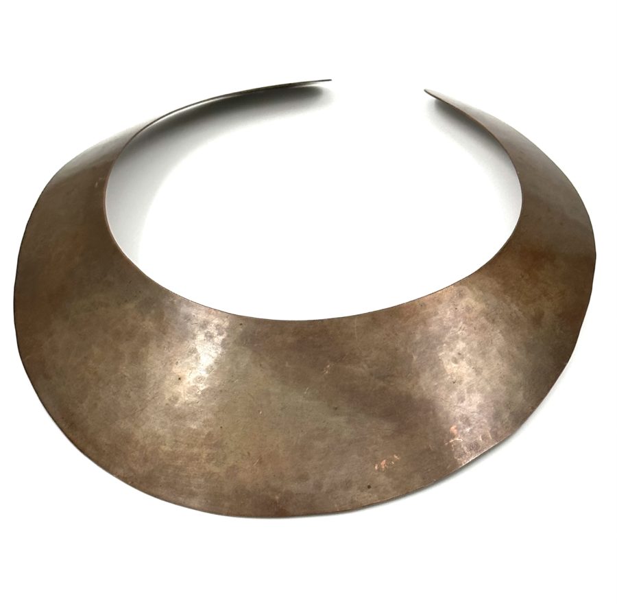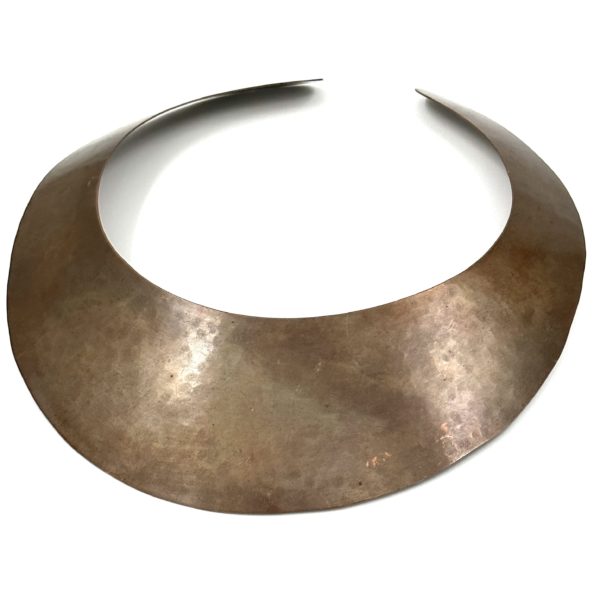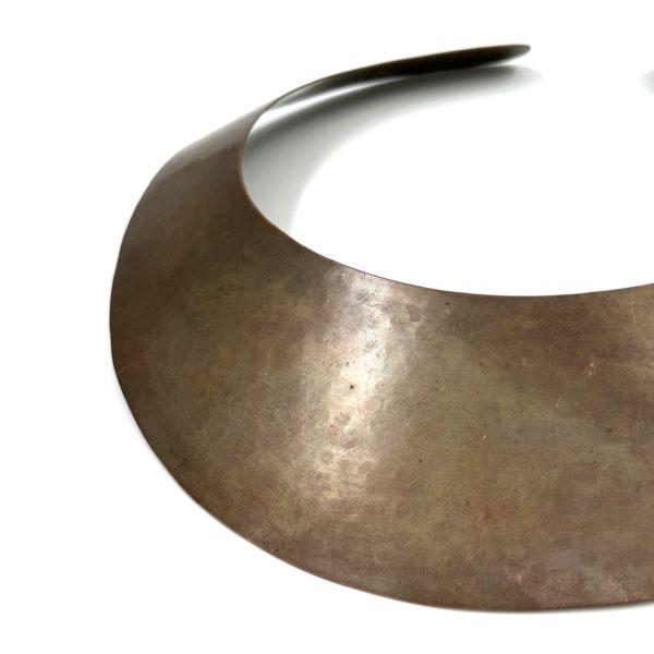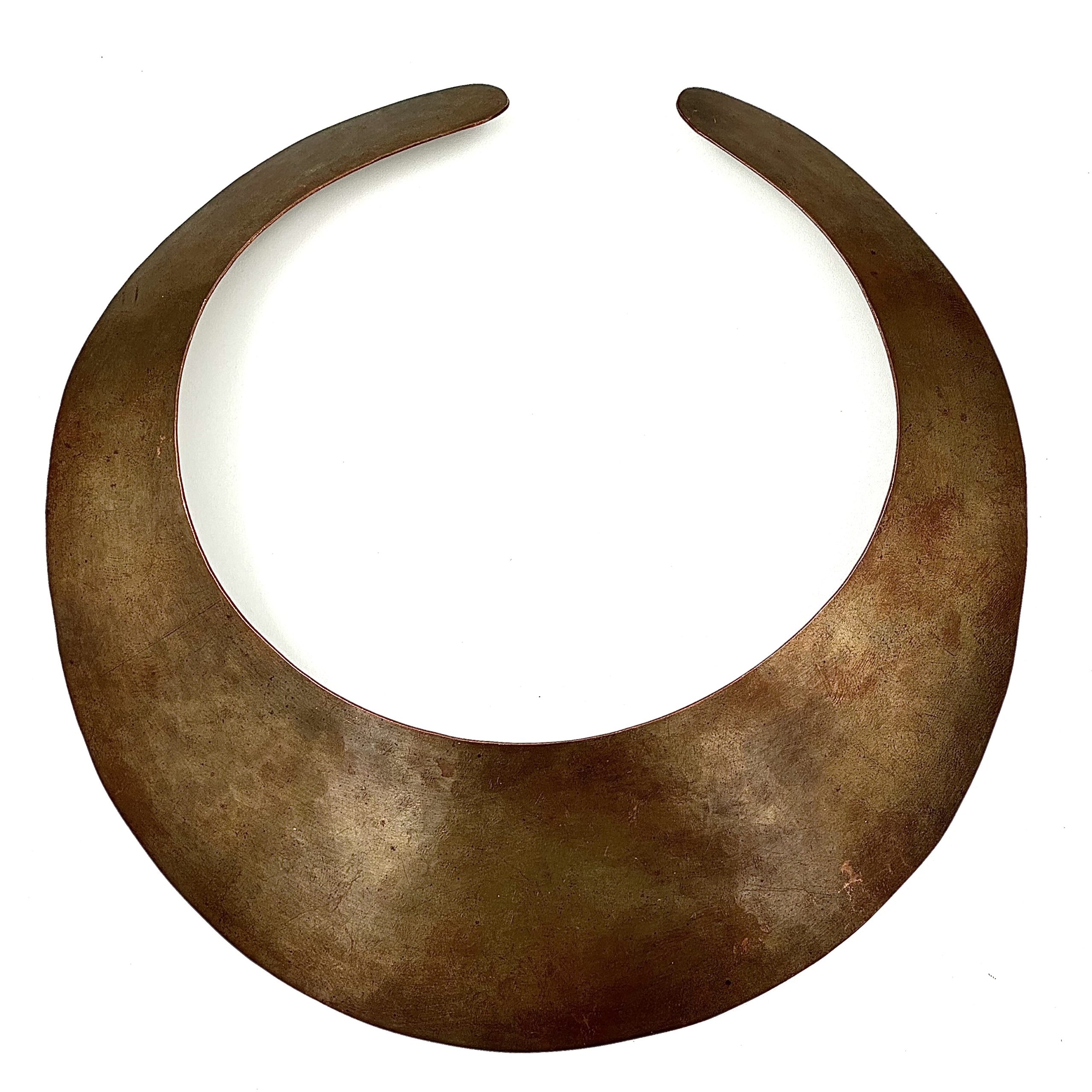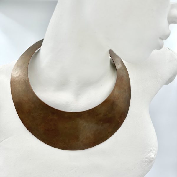 This one of a kind Robert Lee Morris Brass Flat Collar for Calvin Klein was made for his fall show in 1981. The subtalale warm bronzy brown finish matched his color scheme the year, with the Massai Tribal blankets as the collection inspiration. Forged from brass sheet and given a spring so the collar opens and closes easily around one’s neck, the coloration is permanent and classic. Though this is a statement neckpiece, it is a casual look, inviting, warm, easy to wear with so many different clothing choices. Have fun I say!