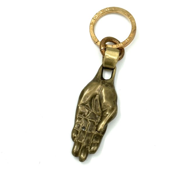 The Robert Lee Morris Brass Hand Keyring Pendant is a unique and rare solid brass casting of a carved hand. It hangs from a signature RLM keyring by a wide bail and is most distinctive.