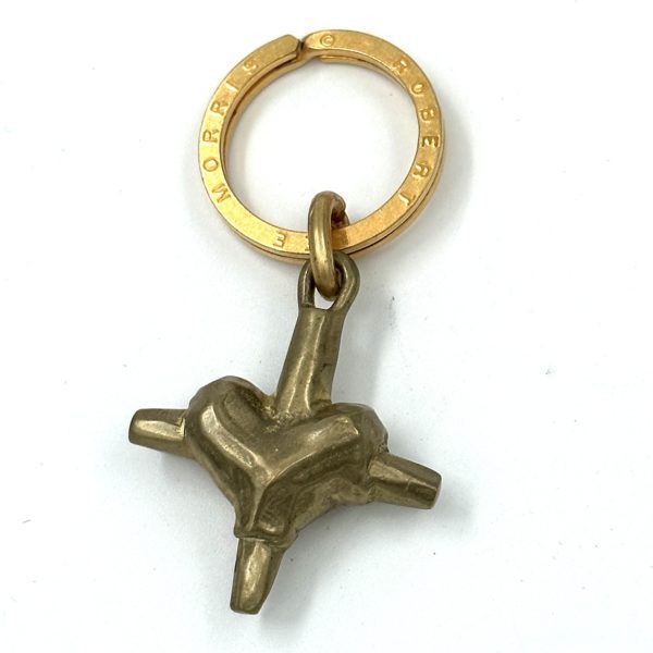 This warm dark khaki colored, Wabi Sabi Robert Lee Morris Brass Heart/Cross hybrid Keyring Pendant, is a great example of the spontaneous style of wax carving the Morris has. The crude and chunky nature of this symbol is signature Morris, and the dark tarnished color is beautiful. The heart literally is merged with a whittled cross that comes right into and through it. Surrealistic and fascinating design.