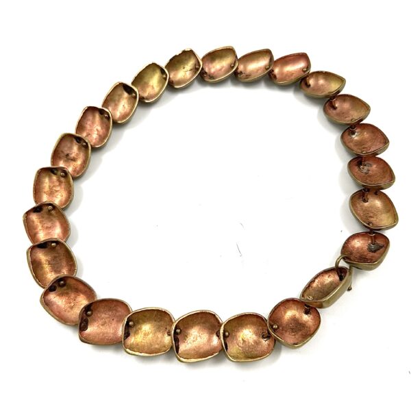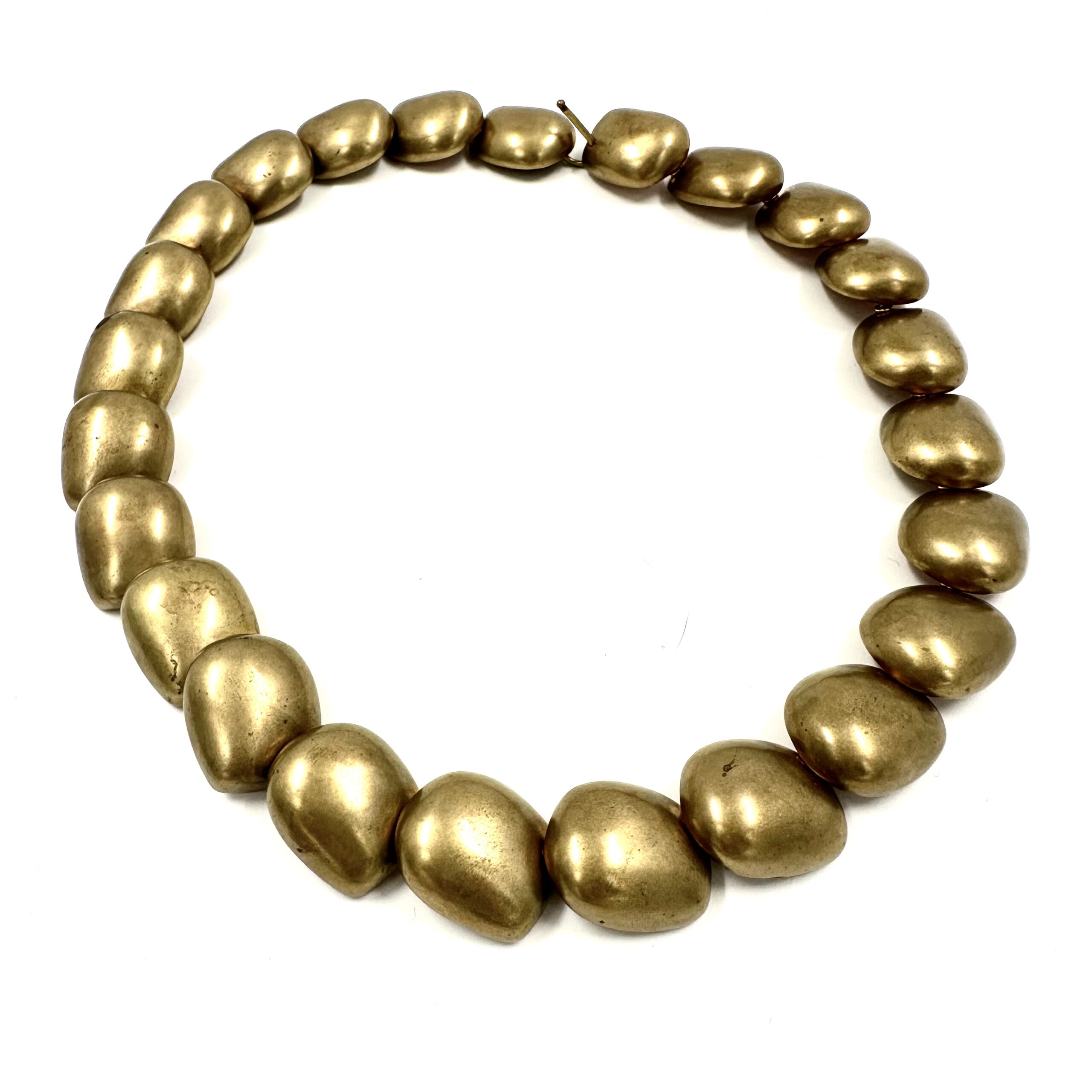 This Robert Lee Morris Brass Round Pebble Necklace is one of the many different shaped forms he made during the late 1980 collections. The Pebble form, created by wax carving, was used both for Donna Karan and his own collections as it was so organic and soft looking. this necklace is one of the early prototypes, hollow and lightweight, but strong snd full in its appearance. The way it is constructed, it fits perfectly around the neck, sits exactly as one would want. the matte brass finish can easily be left to age and attain its natural patina or be polished to maintain its current look. Because it is un-plated brass, it belongs in the Wabi Wabi category of aged and worn looking jewelry\ and has a warm golden glow to it.