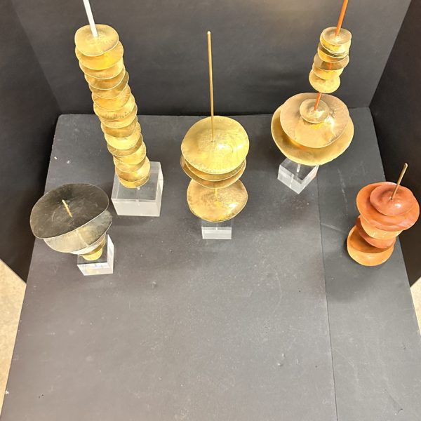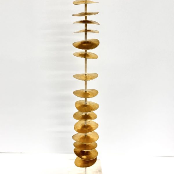 Robert Lee Morris Brass Sculpture #101, Tall Skinny Tower Stack is a simple but arrestingly strong artwork for the home. The “Stack” name applies to all the sculptures that Morris makes whereby metal discs are threaded onto a metal pole, separated by various lengths of brass tubing. The effect is a bit similar to a strand of Eucalyptus plant, where round leaves are spaced along a vine. This piece is part of a series of small sculptures meant to be shown alone or in groupings with similar stacks as seen in the gallery photos. The color accident of white tubings add a new feature to the contemporary sculpture work that Morris is currently making. In some cases he uses a red/orange color accent to offset the brass. Sitting in a cube of clear lucite, the tower is 18″ tall and each dis  measures 2″ diameter.