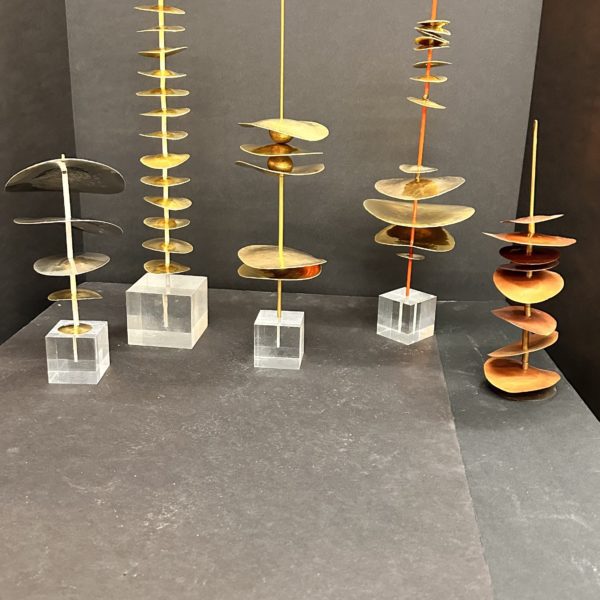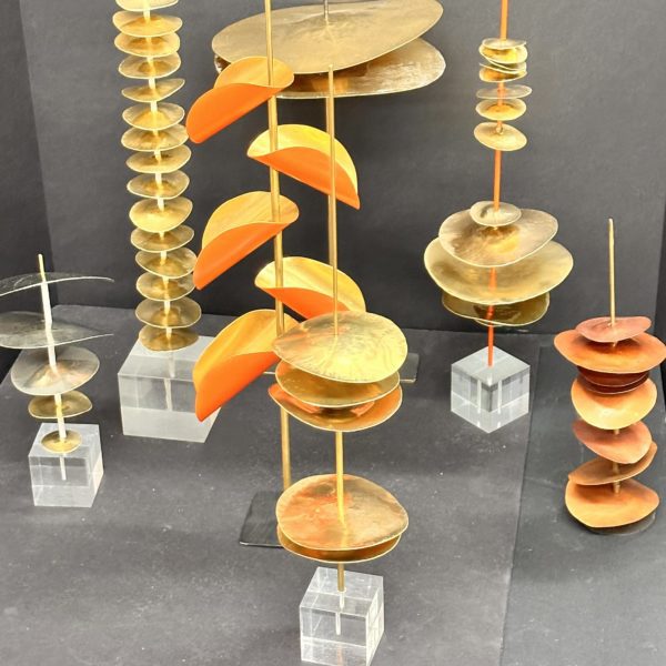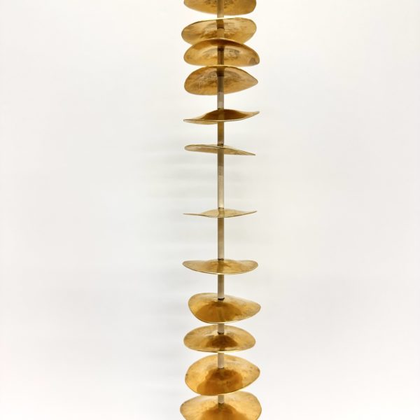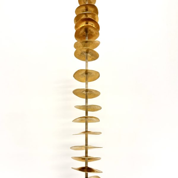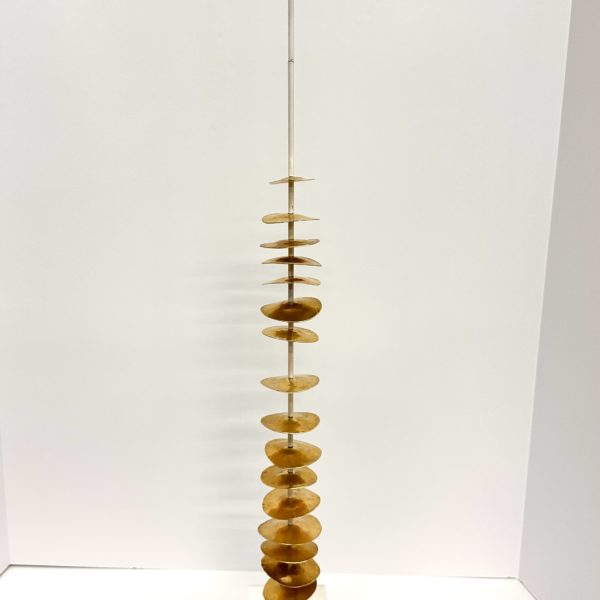 Robert Lee Morris Brass Sculpture #101, Tall Skinny Tower Stack is a simple but arrestingly strong artwork for the home. The “Stack” name applies to all the sculptures that Morris makes whereby metal discs are threaded onto a metal pole, separated by various lengths of brass tubing. The effect is a bit similar to a strand of Eucalyptus plant, where round leaves are spaced along a vine. This piece is part of a series of small sculptures meant to be shown alone or in groupings with similar stacks as seen in the gallery photos. The color accident of white tubings add a new feature to the contemporary sculpture work that Morris is currently making. In some cases he uses a red/orange color accent to offset the brass. Sitting in a cube of clear lucite, the tower is 18″ tall and each dis  measures 2″ diameter.