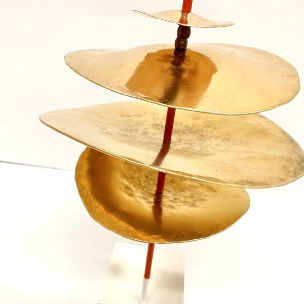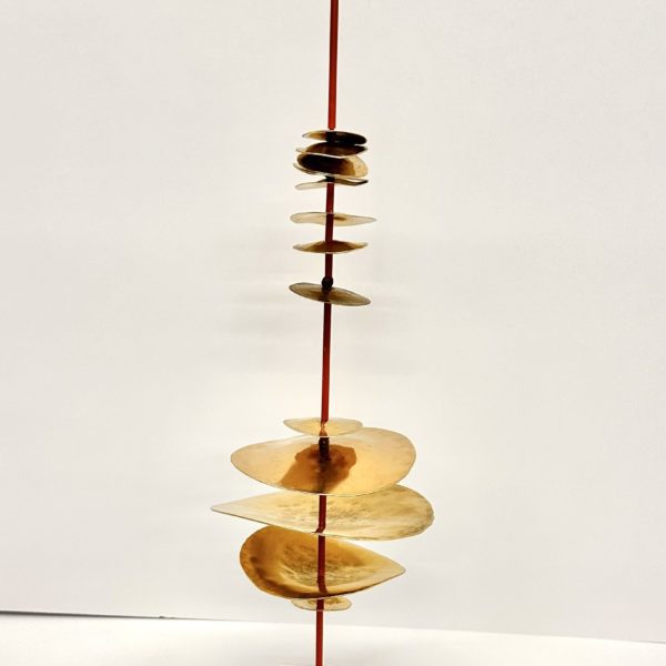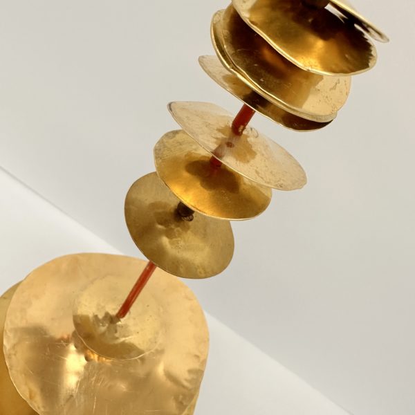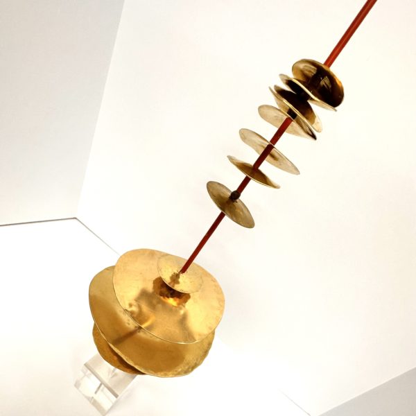 Robert Lee Morris Brass Sculpture #102, Small Graduated Stack is a simple but arrestinglyvibrant artwork for the home. The “Stack” name applies to all the sculptures that Morris makes whereby metal discs are threaded onto a metal pole, separated by various lengths of brass tubing. The effect is a bit similar to a strand of Eucalyptus plant, where round leaves are spaced along a vine. This piece is part of a series of small sculptures meant to be shown alone or in groupings with similar stacks as seen in the gallery photos. The color accent of vermillion tubings add a new feature to the contemporary sculpture work that Morris is currently making. In some cases he uses a white color accent to offset the brass. Sitting in a cube of clear lucite, the tower is 18″ tall with discs measuring from 2″-5″ in diameter. There is a light, whimsical nature to this piece, like a poem or happy song.