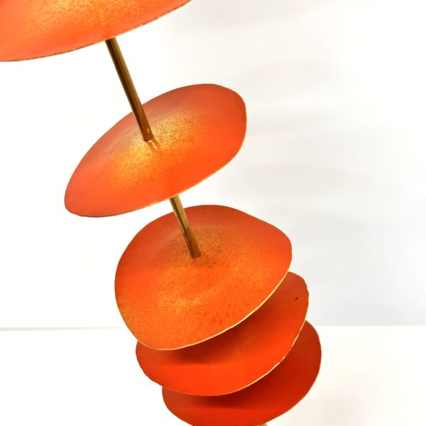 Robert Lee Morris Brass Sculpture # 104, Vermillion Short Stack, is a simple but arrestingly strong artwork for the home. The “Stack” name applies to all the sculptures that Morris makes whereby metal discs are threaded onto a metal pole, separated by various lengths of brass tubing. The effect is a bit similar to a strand of Eucalyptus plant, where round leaves are spaced along a vine. This piece is part of a series of small sculptures meant to be shown alone or in groupings with similar stacks as seen in the gallery photos. Morris is now experimenting with the addition of accent colors of white or vermillion and in this piece only the tops of the discs are colored while the underside is left as shiny brass, causing a beautiful reflection of colors. the base is a cube of lucite providing the weight and strength to secure this plant like work of art.