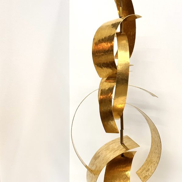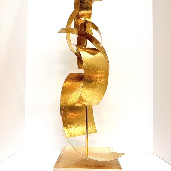 Robert Lee Morris Brass Sculpture #108, Large Calligraphic Stack is art for the home. This vertical construction is based on the “Stack” form of forged metal parts that are threaded on a vertical pole, similar to the Eucalyptus plant. Only this version is using curved rectangular pieces that are able to bar moved around and re-arranged like a living sculpture. The base is heavy lucite. It is called “calligraphic” due to the feeling that it could be seen as brush strokes, or an alien alphabet read vertically. This is a strong piece of art for the home or office. At 30″ high, this is a perfect size to move around one’s environment as personal expression.