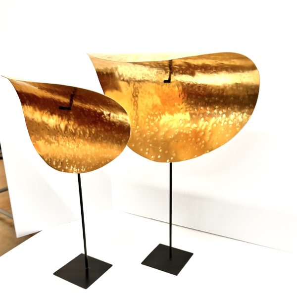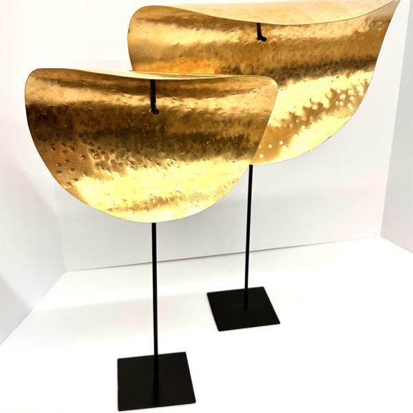 The Robert Lee Morris Brass Sculpture #113, Medium Fold-over Sail, is a powerful image and great work of art for the home or office. The Sail sculpture concept by Morris is that a wind or spiritual force is “blowing” the metal sheet, whether it is in a round or squared shape. This Sail is forged into a curling form, with a hole in the center that is pierced by ย small “hook” coming off the black stand. The total final effect is quite a minimal but bold look. The way that light flows over and around this arched shape is typical Morris style. Simple, strong, graphic and stunning visually, this sculpture is great as a stand alone piece of as part of a set as seen the the gallery photo.