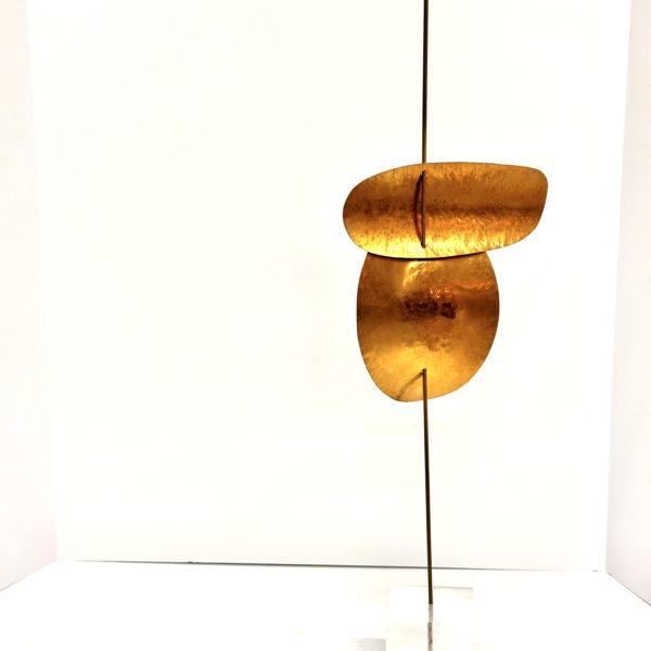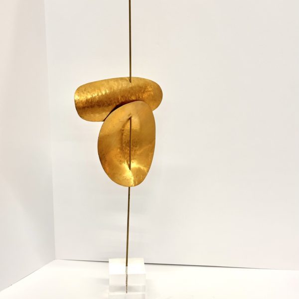 The Robert Lee Morris Brass Sculpture #114, Back to Back Pierced Sails, is a very simple construction that uses the force of the curve to hold the forms in place on the vertical rod. Fascinated by vertical sculptures, using a heavy base, a rod and then threading various forms into the rod, Morris has created a vast family of such pieces. this one is a stand alone artwork for ones home or office. The base is a lucite cube and the simplicity of this construction is what makes it so cool. After forging the oval sheets into strong arcs, a rod is forced to three between the two holes, and the force of the curve is what grips the rod and holds the pieces in place. Friction. In fact one can move these two pieces around up or down the rod to change the look of the piece if wanted. The heart of the design is the space where the top horizontal sail fits tightly onto the back of the bottom vertical oval sail, nestling together like lovers in bed.