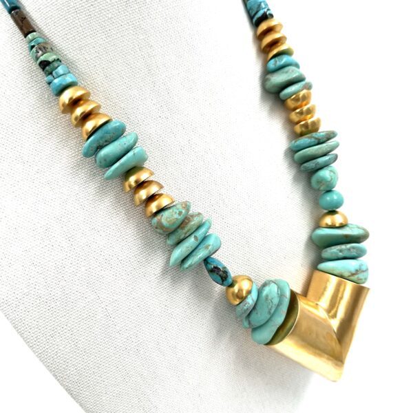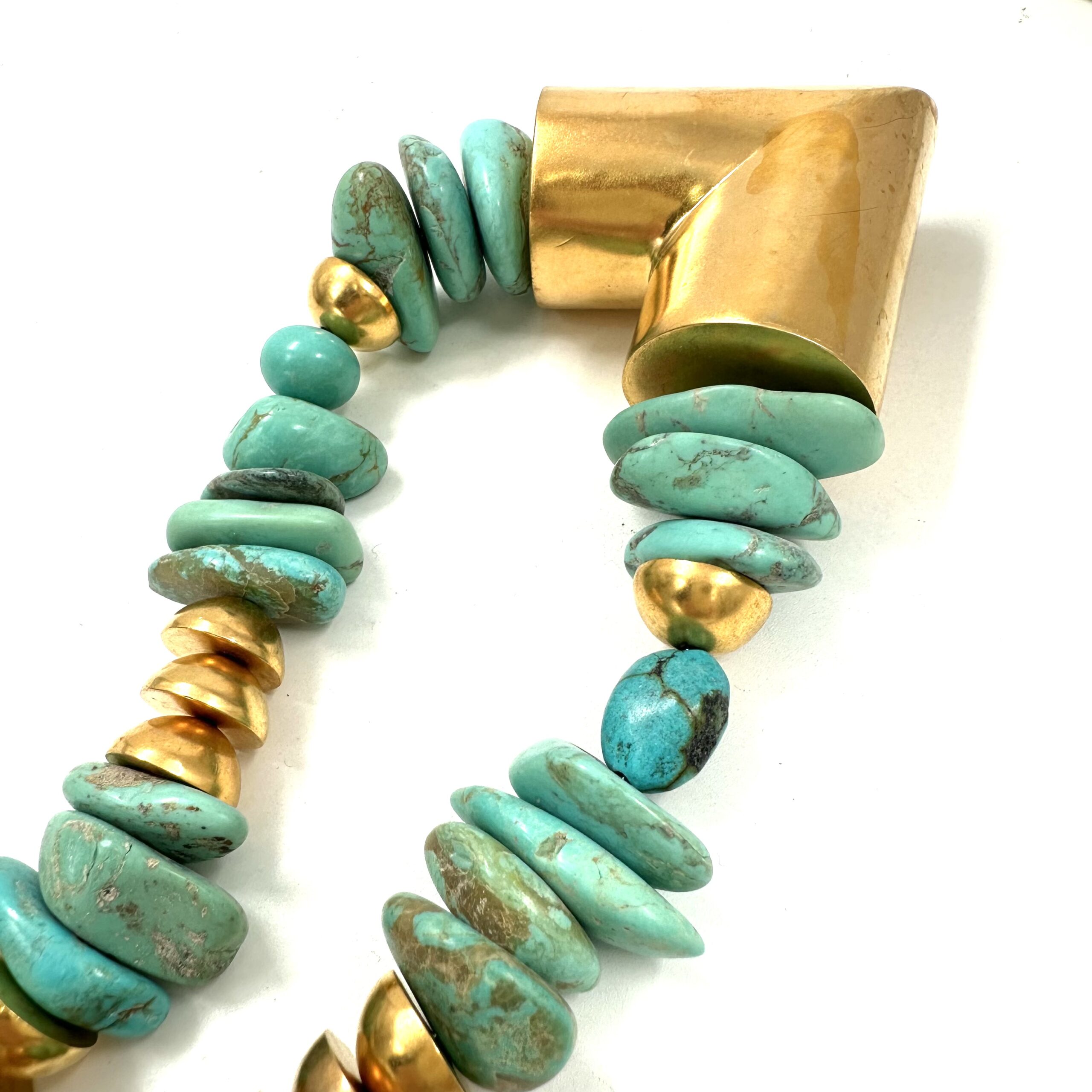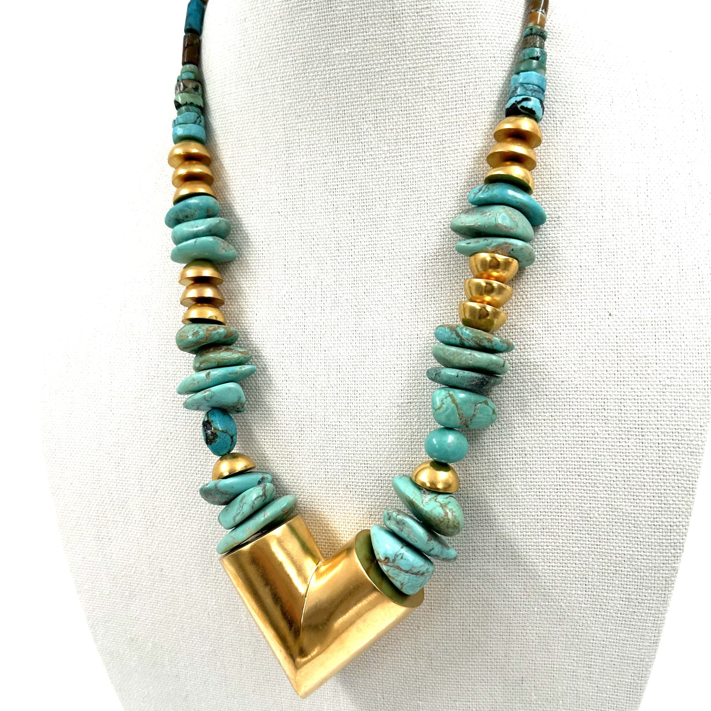 This unique and one-of-a-kind Robert Lee Morris Chunky Turquoise Gold Chevron Necklace is dramatic both in the scale of the gold plated centerpiece and the bold turquoise beads. Strikingly gorgeous with the gold and turquoise color combination, the very chunky turquoise beads are luscious to behold. Notice the use of the gold half domes that create an unusual pattern.