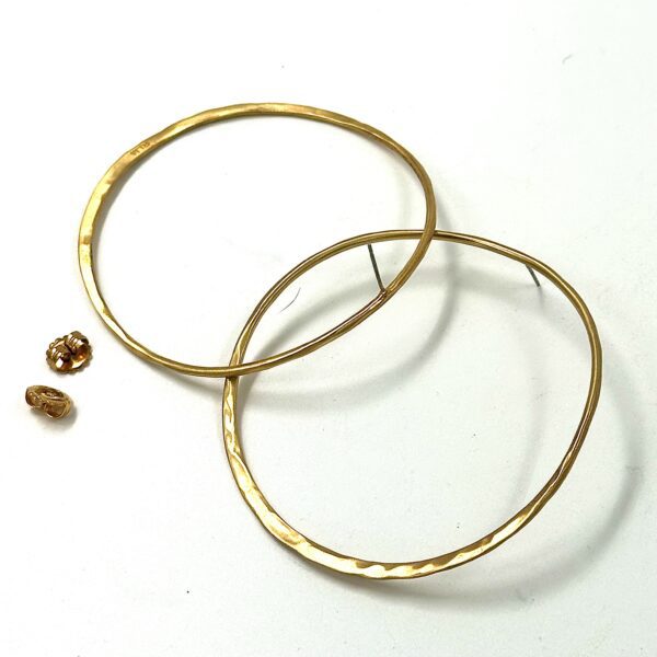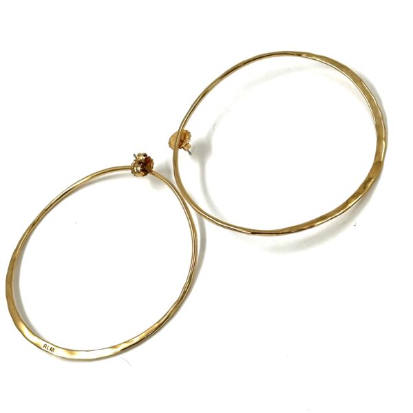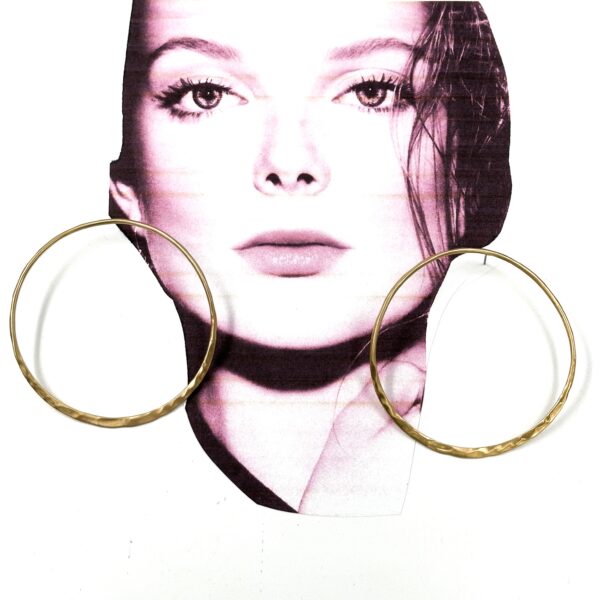 The Robert Lee Morris Colossal Hoop Earrings, are a Shiny Gold Plated forged brass. Large and thin and dramatic these are 3″ in diameter and paper lightweight. 14k posts Super chic and classic high fashion.