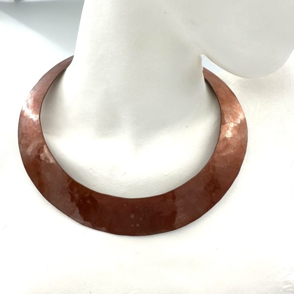 This Robert Lee Morris Copper Flat Collar for Calvin Klein, was created in 1981. Forged from copper sheet and heat treated to attain its permanent ruddy red color, this is a fabulous addition to ones fashion wardrobe vocabulary. The addition of a warm copper neckband to finish off a fall outfit of tweeds and wool, is a perfect classic look. Easy to bend open with a spring motion, the collar will open easily to fit any neck. The hammer marks are sensational, and makes this a very Wabi Sabi piece of  handmade art. Note the closeup of the signature.