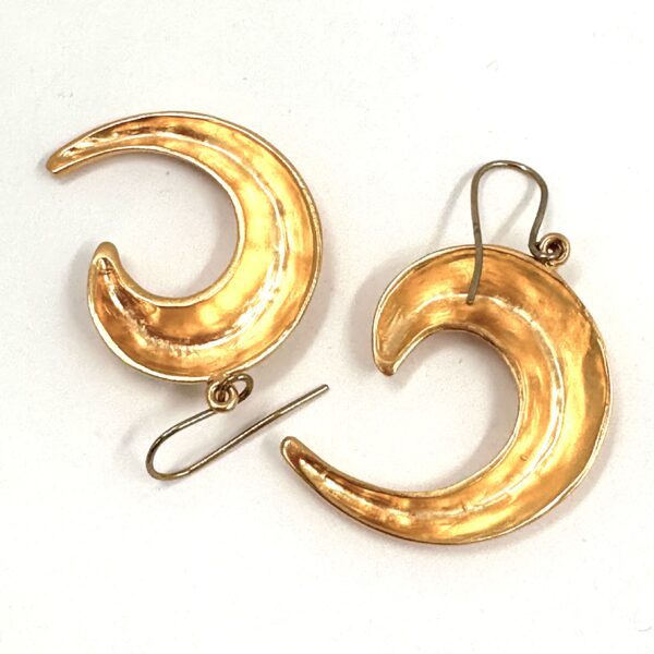 These Robert Lee Morris Dangling Claw Earrings are a bold gold plated brass. They swing from a 14k wire. Like a strong crescent gestural shape that moves and glows gold!