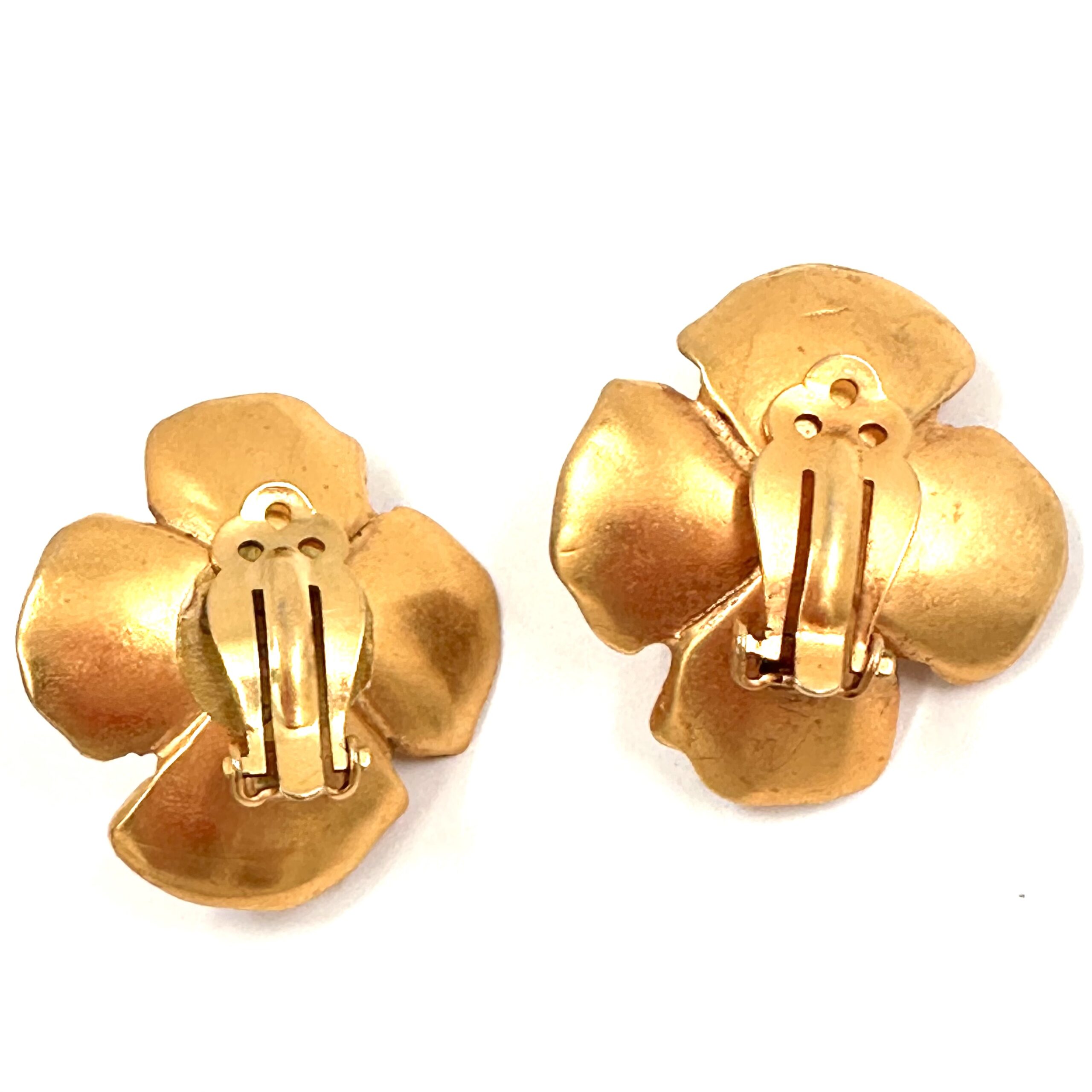 These lovely Robert Lee Morris Dogwood Earrings are so delicate and still a bold statement earring. The carving of this flower is masterfully done, looking so realistic on ones ear. A flower nestled in ones hair is always a romantic vision, so are these golden dogwood blossoms as they nestle on the sides of your head. Gold plated brass, clips.