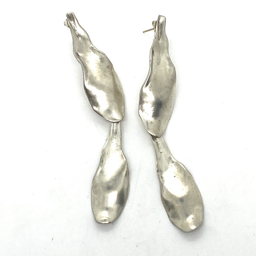During the late 1980’s I was creating a lot of floral themes for the jewelry and for hardware for my handbags. This pair of sterling silver earrings are from Zennia petals, curved from wax, and constructed into a double long dangling earring. Sterling silver but with a matte finish. 14k gold posts.