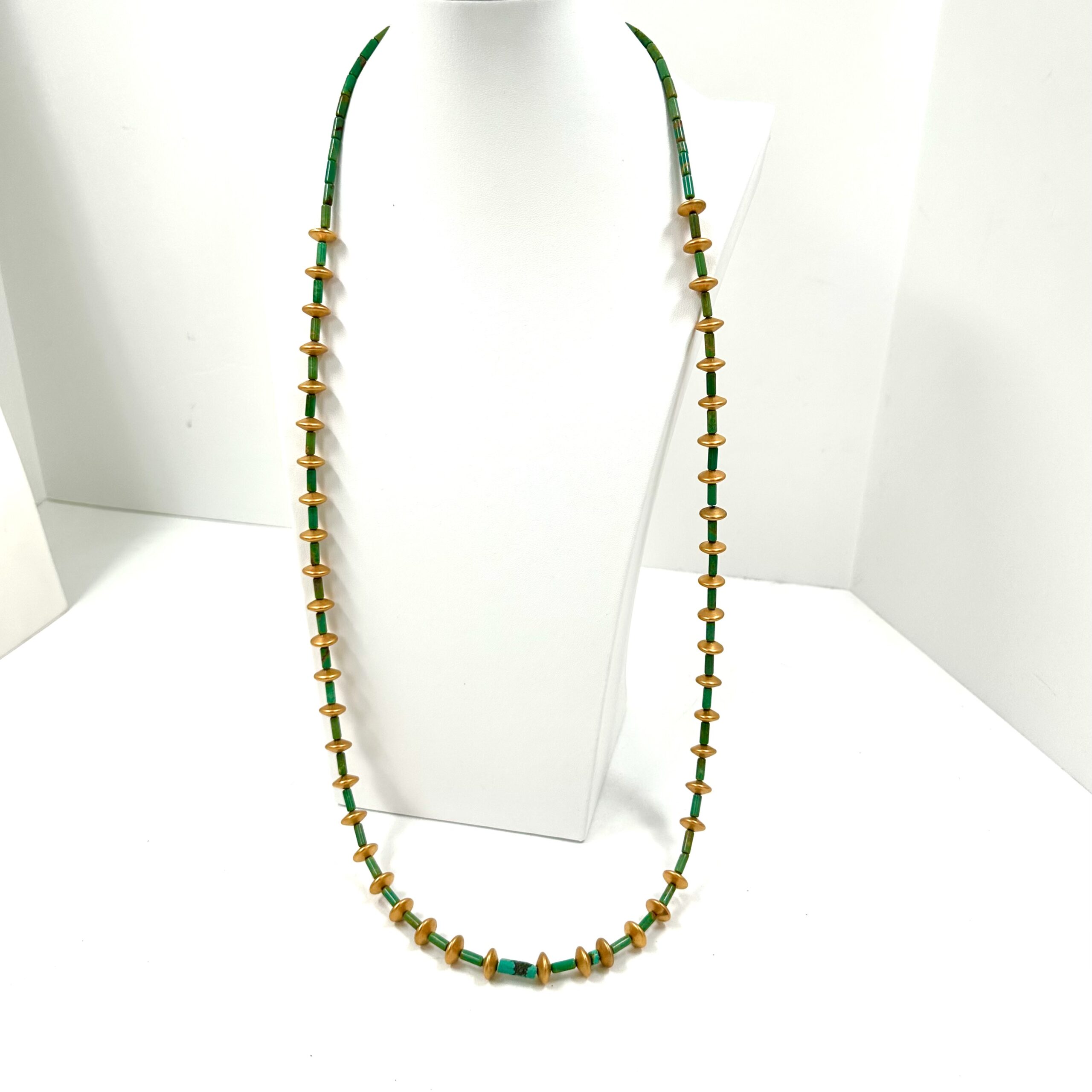This unusual Robert Lee Morris Elongated Turquoise Saturn Necklace is 44′ long which makes it a crazy fun accessory for your colorful bead wardrobe. Easy to wear doubled, the alternating rhythm of the Saturn shaped gold beads and the short tubular turquoise spacers give this a very whimsical look. Have fun wearing it many ways. Layer it will other multicolored pieces.